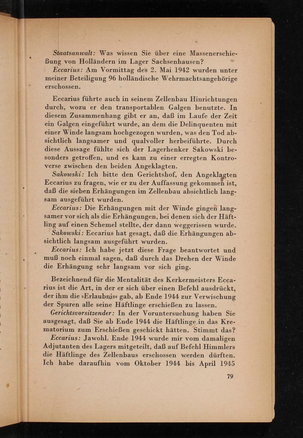 Eccarius führte auch in seinem Zellenbau Hinrichtungen durch, wozu er den transportablen Galgen benutzte. In diesem Zusammenhang gibt er an, daß im Laufe der Zeit ein Galgen eingeführt wurde, an dem die Delinquenten mit einer Winde langsam hochgezogen wurden, was den Tod absichtlich langsamer und qualvoller herbeiführte. Durch diese Aussage fühlte sich der Lagerhenker Sakowski besonders getroffen, und es kam zu einer erregten Kontroverse zwischen den beiden Angeklagten.