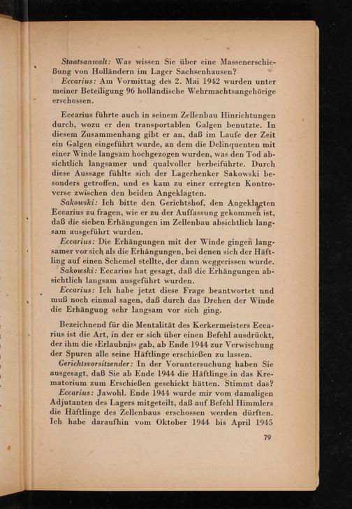 Eccarius: Die Erhängungen mit der Winde gingen langsamer vor sich als die Erhängungen, bei denen sich der Häftling auf einen Schemel stellte, der dann weggerissen wurde. Sakowski: Eccarius hat gesagt, daß die Erhängungen absichtlich langsam ausgeführt wurden.