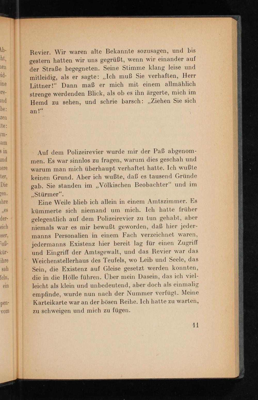 Auf dem Polizeirevier wurde mir der Paß abgenom- men. Es war sinnlos zu fragen, warum dies geschah und warum man mich überhaupt verhaftet hatte. Ich wußte keinen Grund. Aber ich wußte, daß es tausend Gründe gab. Sie standen im„Völkischen Beobachter“ und im „Stürmer“.