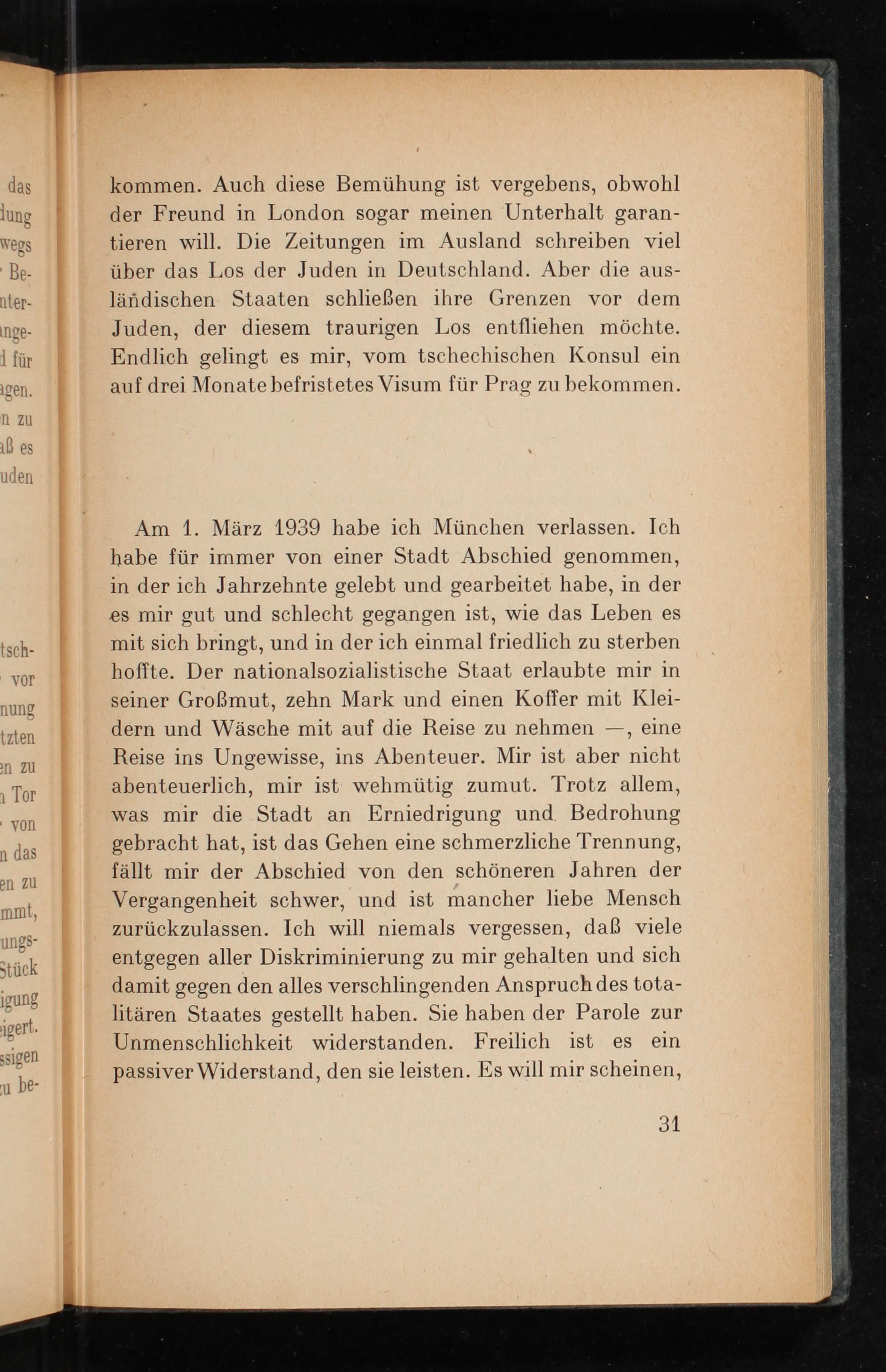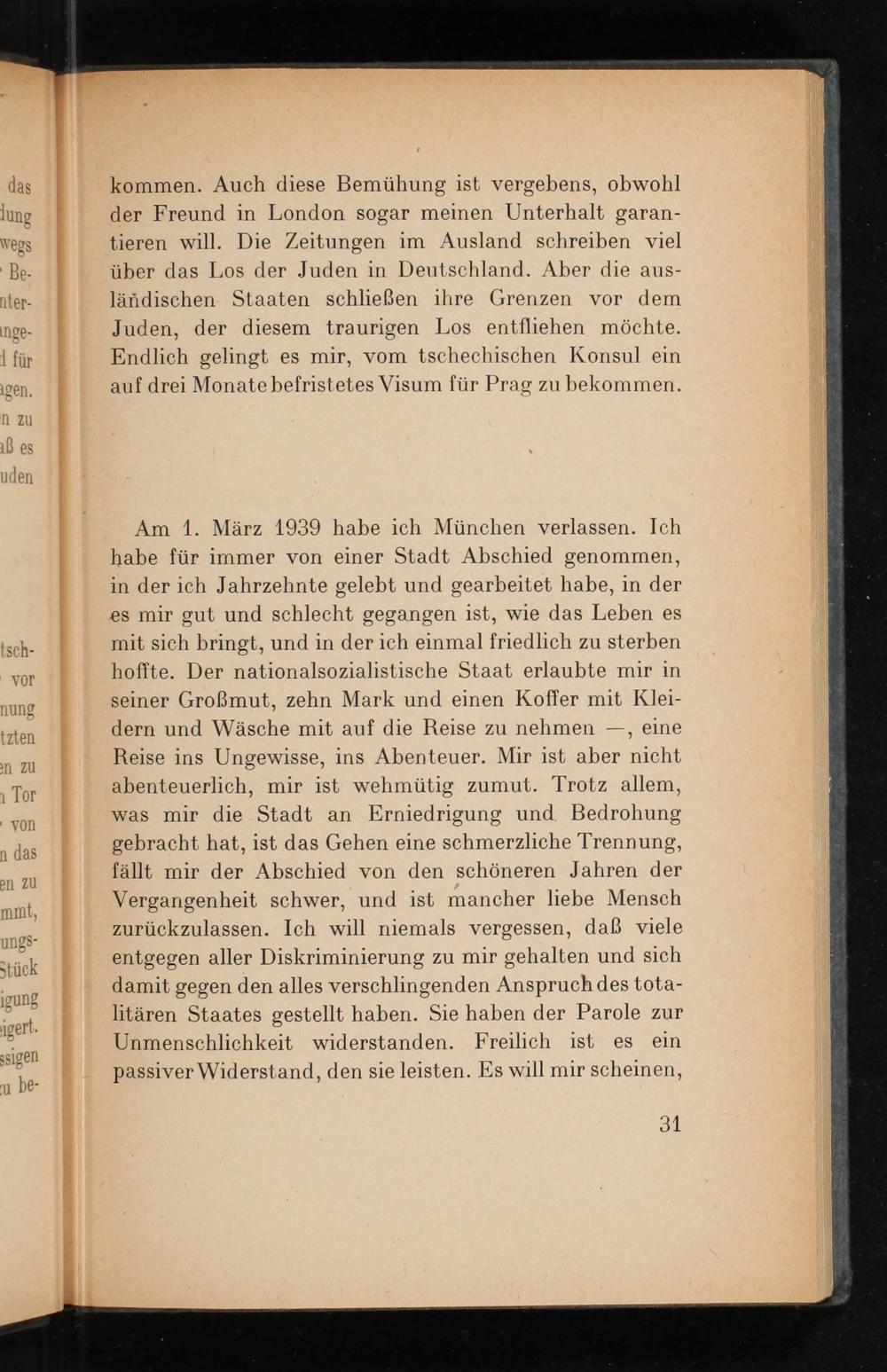 Am 1. März 1939 habe ich München verlassen. Ich habe für immer von einer Stadt Abschied genommen, in der ich Jahrzehnte gelebt und gearbeitet habe, in der es mir gut und schlecht gegangen ist, wie das Leben es mit sich bringt, und in der ich einmal friedlich zu sterben hoffte. Der nationalsozialistische Staat erlaubte mir in seiner Großmut, zehn Mark und einen Koffer mit Klei- dern und Wäsche mit auf die Reise zu nehmen—, eine Reise ins Ungewisse, ins Abenteuer. Mir ist aber nicht abenteuerlich, mir ist wehmütig zumut. Trotz allem, was mir die Stadt an Erniedrigung und. Bedrohung gebracht hat, ist das Gehen eine schmerzliche Trennung, fällt mir der Abschied von den schöneren Jahren der Vergangenheit schwer, und ist mancher liebe Mensch zurückzulassen. Ich will niemals vergessen, daß viele entgegen aller Diskriminierung zu mir gehalten und sich damit gegen den alles verschlingenden Anspruch des tota- litären Staates gestellt haben. Sie haben der Parole zur Unmenschlichkeit widerstanden. Freilich ist es ein passiver Widerstand, den sie leisten. Es will mir scheinen,