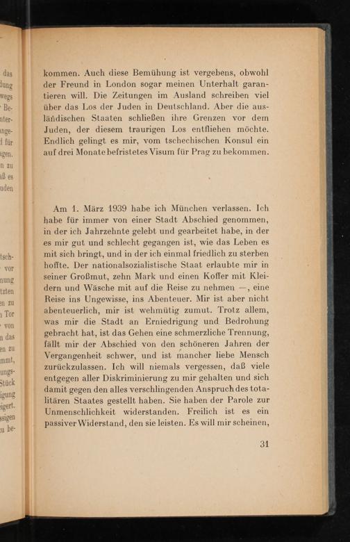 kommen. Auch diese Bemühung ist vergebens, obwohl der Freund in London sogar meinen Unterhalt garan- tieren will. Die Zeitungen im Ausland schreiben viel über das Los der Juden in Deutschland . Aber die aus- ländischen Staaten schließen ihre Grenzen vor dem Juden, der diesem traurigen Los entfliehen möchte. Endlich gelingt es mir, vom tschechischen Konsul ein auf drei Monate befristetes Visum für Prag zu bekommen.