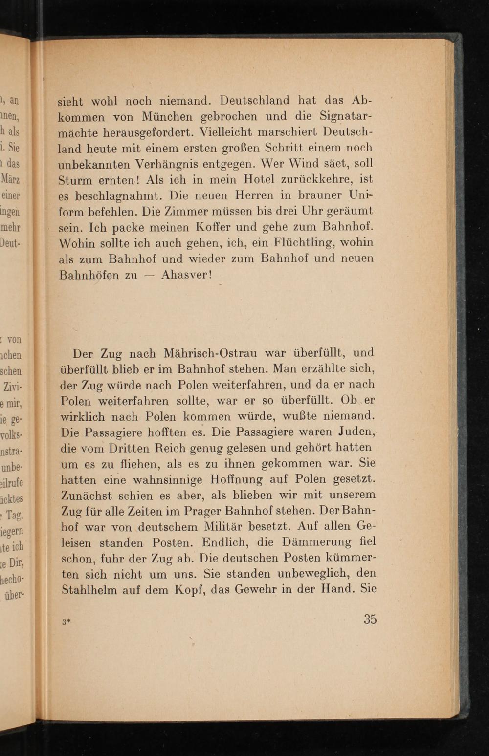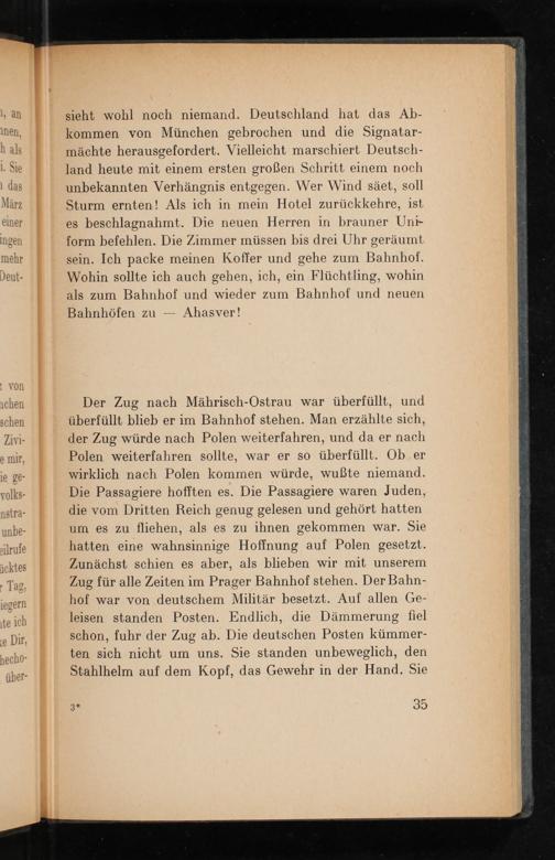 Der Zug nach Mährisch- Ostrau war überfüllt, und überfüllt blieb er im Bahnhof stehen. Man erzählte sich, der Zug würde nach Polen weiterfahren, und da er nach Polen weiterfahren sollte, war er so überfüllt. Ob er wirklich nach Polen kommen würde, wußte niemand. Die Passagiere hofften es. Die Passagiere waren Juden, die vom Dritten Reich genug gelesen und gehört hatten um es zu fliehen, als es zu ihnen gekommen war. Sie hatten eine wahnsinnige Hoffnung auf Polen gesetzt. Zunächst schien es aber, als blieben wir mit unserem Zug für alle Zeiten im Prager Bahnhof stehen. Der Bahnhof war von deutschem Militär besetzt. Auf allen Geleisen standen Posten. Endlich, die Dämmerung fiel schon, fuhr der Zug ab. Die deutschen Posten kümmerten sich nicht um uns. Sie standen unbeweglich, den Stahlhelm auf dem Kopf, das Gewehr in der Hand. Sie