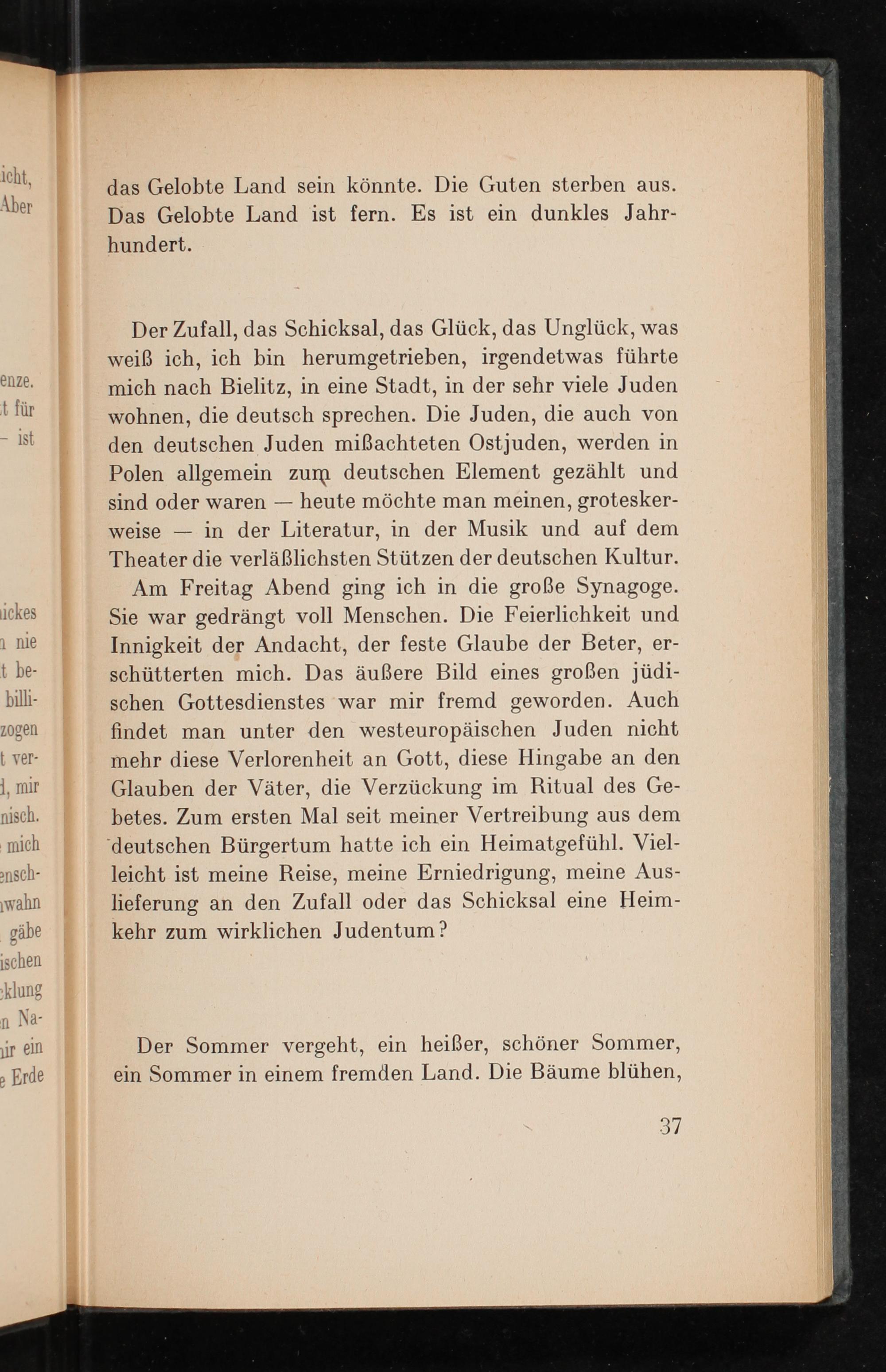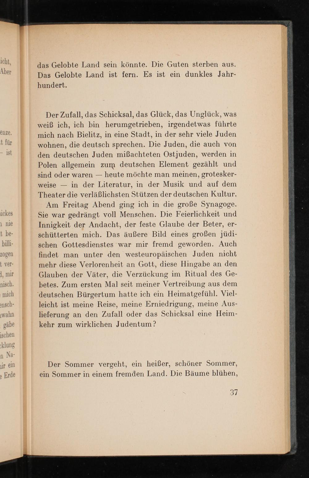 Der Zufall, das Schicksal, das Glück, das Unglück, was weiß ich, ich bin herumgetrieben, irgendetwas führte mich nach Bielitz , in eine Stadt, in der sehr viele Juden wohnen, die deutsch sprechen. Die Juden, die auch von den deutschen Juden miẞachteten Ostjuden, werden in Polen allgemein zum deutschen Element gezählt und sind oder waren- heute möchte man meinen, groteskerweise in der Literatur, in der Musik und auf dem Theater die verläßlichsten Stützen der deutschen Kultur. Am Freitag Abend ging ich in die große Synagoge. Sie war gedrängt voll Menschen. Die Feierlichkeit und Innigkeit der Andacht, der feste Glaube der Beter, erschütterten mich. Das äußere Bild eines großen jüdischen Gottesdienstes war mir fremd geworden. Auch findet man unter den westeuropäischen Juden nicht mehr diese Verlorenheit an Gott, diese Hingabe an den Glauben der Väter, die Verzückung im Ritual des Gebetes. Zum ersten Mal seit meiner Vertreibung aus dem deutschen Bürgertum hatte ich ein Heimatgefühl. Vielleicht ist meine Reise, meine Erniedrigung, meine Auslieferung an den Zufall oder das Schicksal eine Heimkehr zum wirklichen Judentum?
