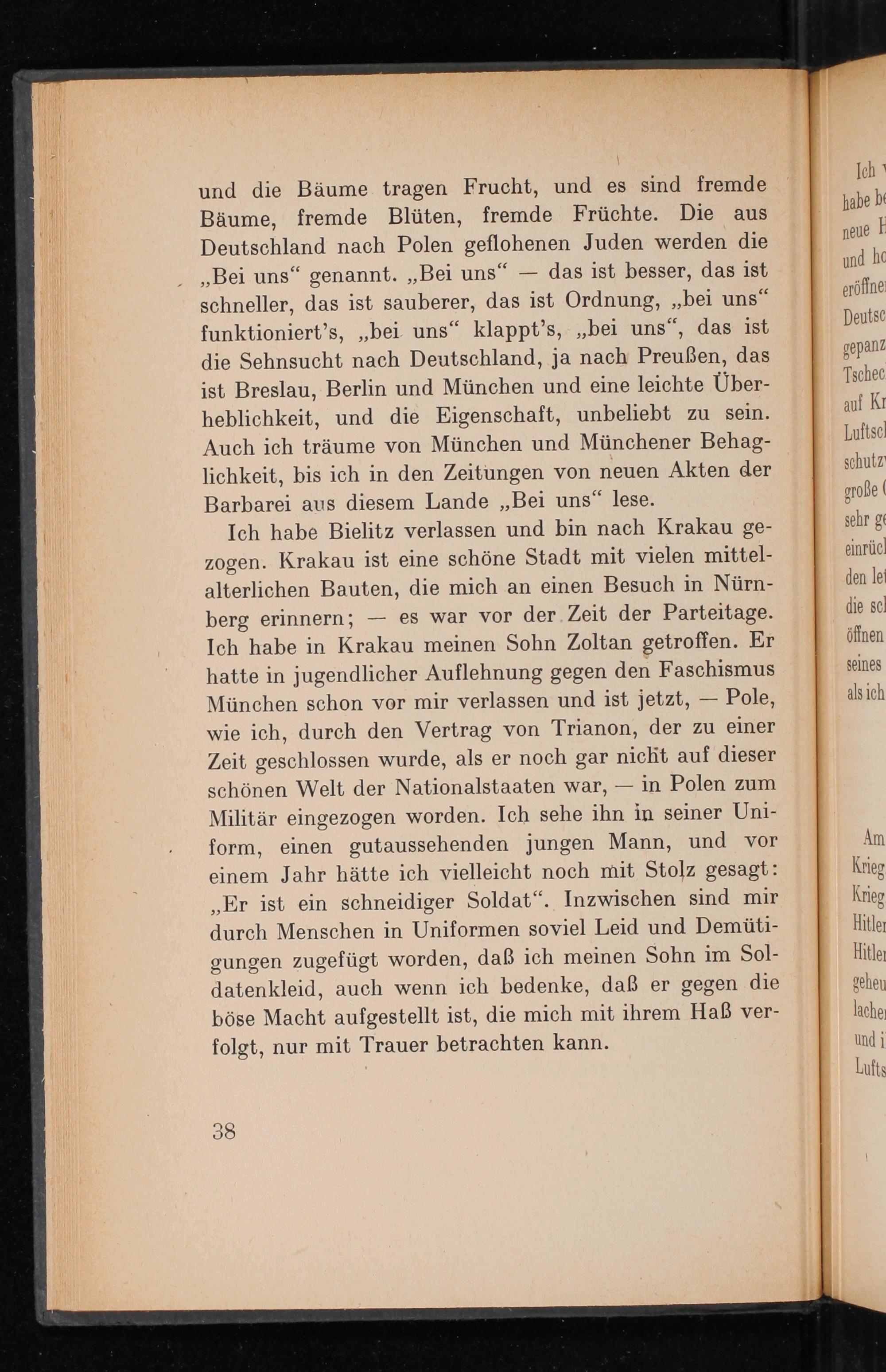 Ich habe Bielitz verlassen und bin nach Krakau gezogen. Krakau ist eine schöne Stadt mit vielen mittelalterlichen Bauten, die mich an einen Besuch in Nürnberg erinnern;- es war vor der Zeit der Parteitage. Ich habe in Krakau meinen Sohn Zoltan getroffen. Er hatte in jugendlicher Auflehnung gegen den Faschismus München schon vor mir verlassen und ist jetzt,- Pole, wie ich, durch den Vertrag von Trianon, der zu einer Zeit geschlossen wurde, als er noch gar nicht auf dieser schönen Welt der Nationalstaaten war, in Polen zum Militär eingezogen worden. Ich sehe ihn in seiner Uniform, einen gutaussehenden jungen Mann, und vor einem Jahr hätte ich vielleicht noch mit Stolz gesagt: ,, Er ist ein schneidiger Soldat". Inzwischen sind mir durch Menschen in Uniformen soviel Leid und Demütigungen zugefügt worden, daß ich meinen Sohn im Soldatenkleid, auch wenn ich bedenke, daß er gegen die böse Macht aufgestellt ist, die mich mit ihrem Haẞ verfolgt, nur mit Trauer betrachten kann.
