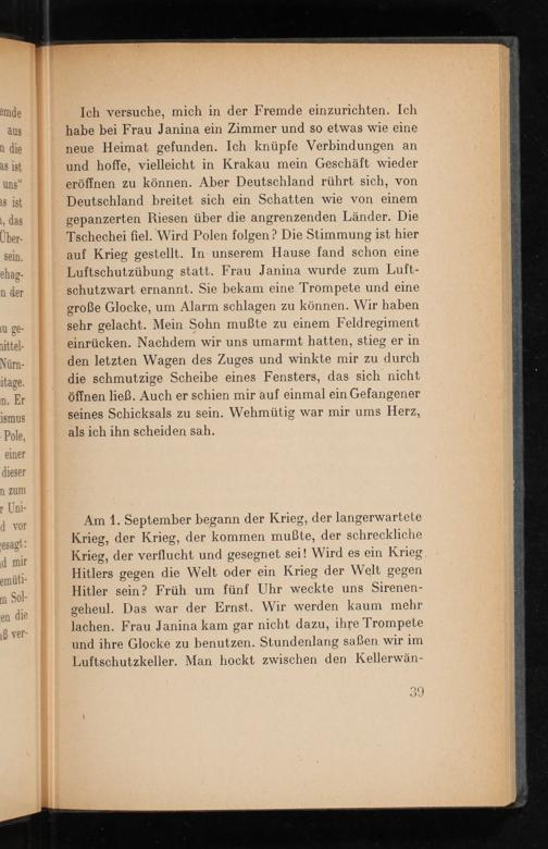 Ich versuche, mich in der Fremde einzurichten. Ich habe bei Frau Janina ein Zimmer und so etwas wie eine neue Heimat gefunden. Ich knüpfe Verbindungen an und hoffe, vielleicht in Krakau mein Geschäft wieder eröffnen zu können. Aber Deutschland rührt sich, von Deutschland breitet sich ein Schatten wie von einem gepanzerten Riesen über die angrenzenden Länder. Die Tschechei fiel. Wird Polen folgen? Die Stimmung ist hier auf Krieg gestellt. In unserem Hause fand schon eine Luftschutzübung statt. Frau Janina wurde zum Luftschutzwart ernannt. Sie bekam eine Trompete und eine große Glocke, um Alarm schlagen zu können. Wir haben sehr gelacht. Mein Sohn mußte zu einem Feldregiment einrücken. Nachdem wir uns umarmt hatten, stieg er in den letzten Wagen des Zuges und winkte mir zu durch. die schmutzige Scheibe eines Fensters, das sich nicht öffnen ließ. Auch er schien mir auf einmal ein Gefangener seines Schicksals zu sein. Wehmütig war mir ums Herz, als ich ihn scheiden sah.