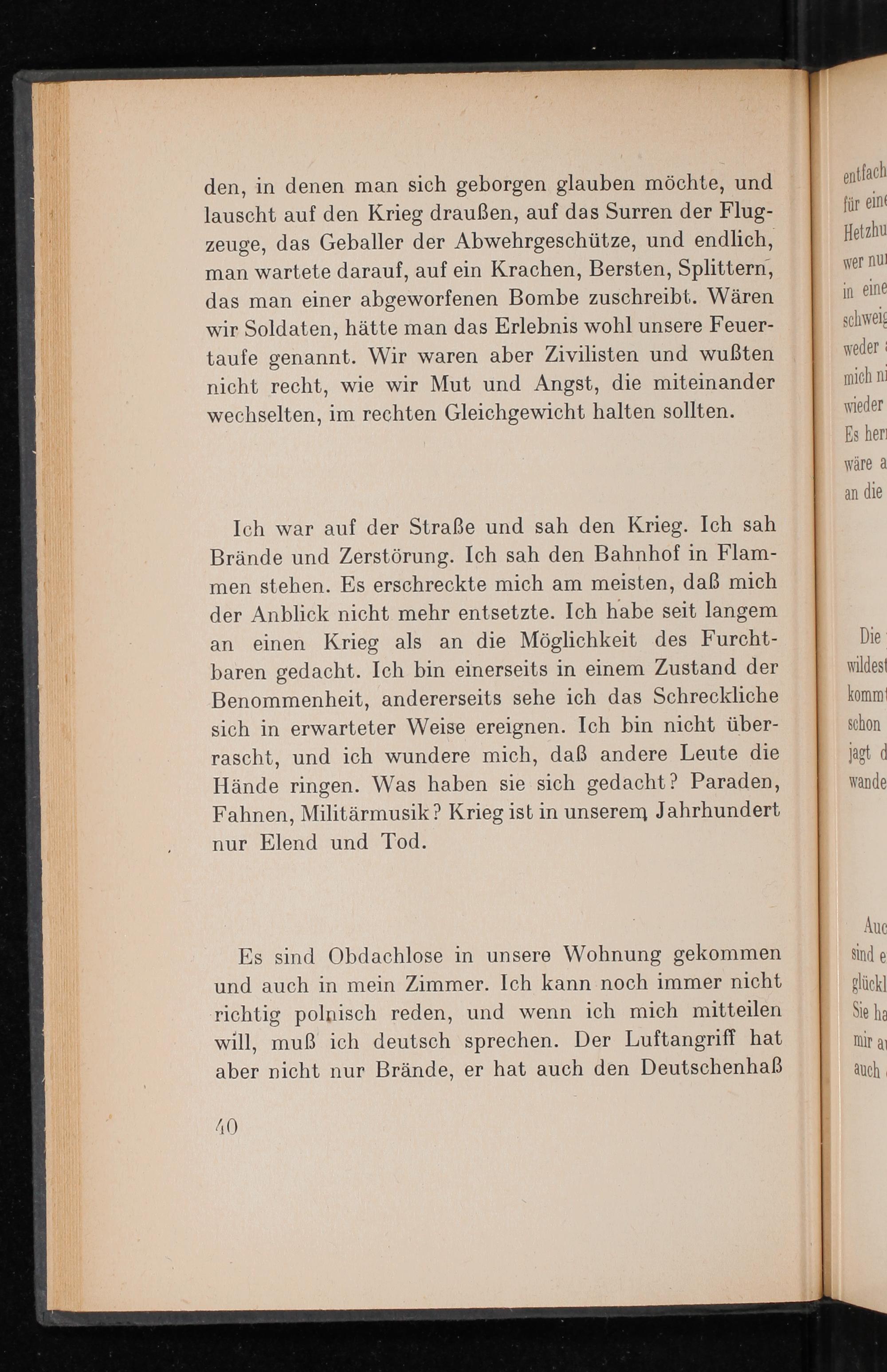Es sind Obdachlose in unsere Wohnung gekommen und auch in mein Zimmer. Ich kann noch immer nicht richtig polnisch reden, und wenn ich mich mitteilen will, muß ich deutsch sprechen. Der Luftangriff hat aber nicht nur Brände, er hat auch den Deutschenhaẞ