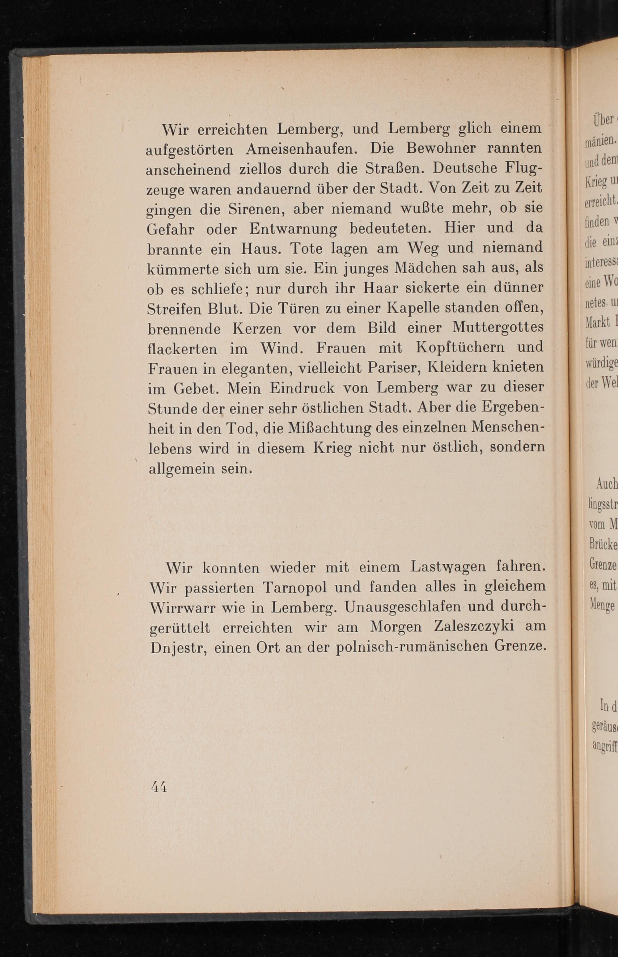 Wir erreichten Lemberg, und Lemberg glich einem aufgestörten Ameisenhaufen. Die Bewohner rannten anscheinend ziellos durch die Straßen. Deutsche Flugzeuge waren andauernd über der Stadt. Von Zeit zu Zeit gingen die Sirenen, aber niemand wußte mehr, ob sie Gefahr oder Entwarnung bedeuteten. Hier und da brannte ein Haus. Tote lagen am Weg und niemand kümmerte sich um sie. Ein junges Mädchen sah aus, als ob es schliefe; nur durch ihr Haar sickerte ein dünner Streifen Blut. Die Türen zu einer Kapelle standen offen, brennende Kerzen vor dem Bild einer Muttergottes flackerten im Wind. Frauen mit Kopftüchern und Frauen in eleganten, vielleicht Pariser, Kleidern knieten im Gebet. Mein Eindruck von Lemberg war zu dieser Stunde der einer sehr östlichen Stadt. Aber die Ergebenheit in den Tod, die Miẞachtung des einzelnen Menschenlebens wird in diesem Krieg nicht nur östlich, sondern allgemein sein.