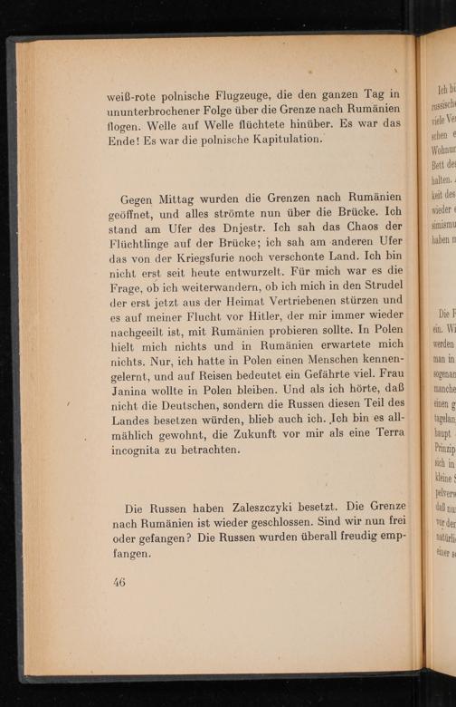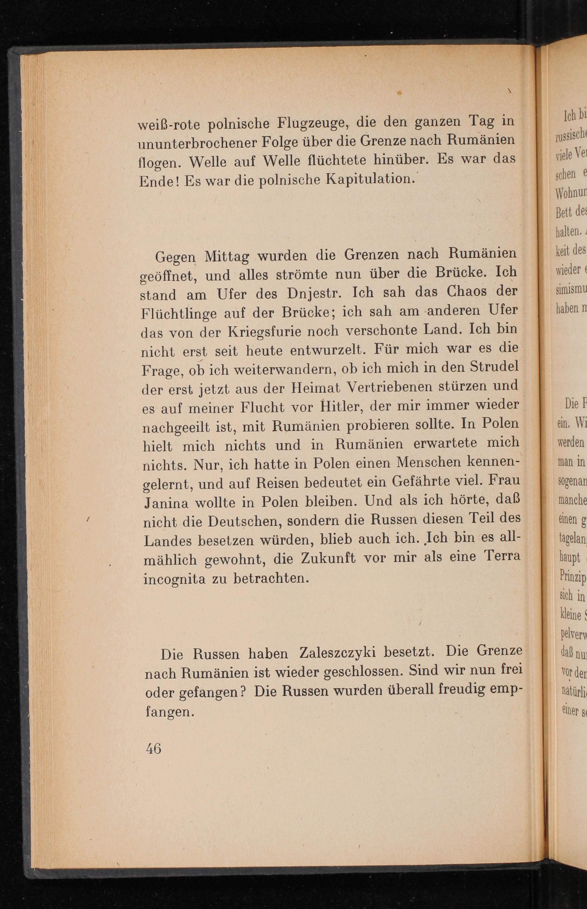 Gegen Mittag wurden die Grenzen nach Rumänien geöffnet, und alles strömte nun über die Brücke. Ich stand am Ufer des Dnjestr . Ich sah das Chaos der Flüchtlinge auf der Brücke; ich sah am anderen Ufer das von der Kriegsfurie noch verschonte Land. Ich bin nicht erst seit heute entwurzelt. Für mich war es die Frage, ob ich weiterwandern, ob ich mich in den Strudel der erst jetzt aus der Heimat Vertriebenen stürzen und es auf meiner Flucht vor Hitler , der mir immer wieder nachgeeilt ist, mit Rumänien probieren sollte. In Polen hielt mich nichts und in Rumänien erwartete mich nichts. Nur, ich hatte in Polen einen Menschen kennengelernt, und auf Reisen bedeutet ein Gefährte viel. Frau Janina wollte in Polen bleiben. Und als ich hörte, daß nicht die Deutschen, sondern die Russen diesen Teil des Landes besetzen würden, blieb auch ich. Ich bin es allmählich gewohnt, die Zukunft vor mir als eine Terra incognita zu betrachten.