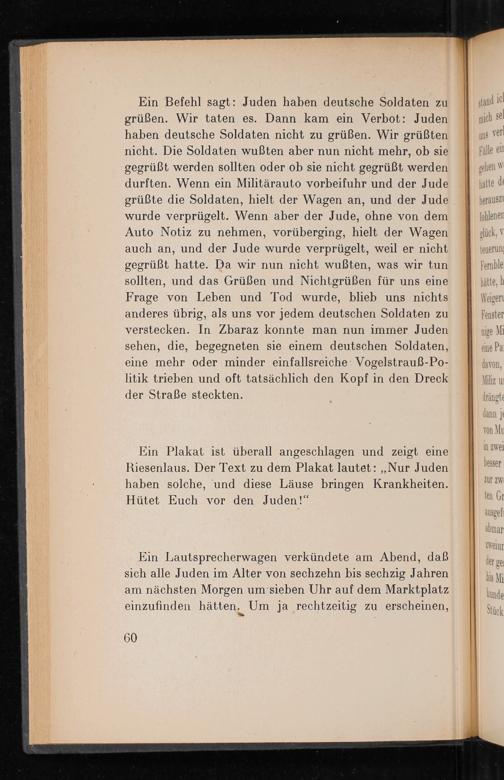Ein Befehl sagt: Juden haben deutsche Soldaten zu grüßen. Wir taten es. Dann kam ein Verbot: Juden haben deutsche Soldaten nicht zu grüßen. Wir grüßten nicht. Die Soldaten wußten aber nun nicht mehr, ob sie gegrüßt werden sollten oder ob sie nicht gegrüßt werden durften. Wenn ein Militärauto vorbeifuhr und der Jude grüßte die Soldaten, hielt der Wagen an, und der Jude wurde verprügelt. Wenn aber der Jude, ohne von dem Auto Notiz zu nehmen, vorüberging, hielt der Wagen auch an, und der Jude wurde verprügelt, weil er nicht gegrüßt hatte. Da wir nun nicht wußten, was wir tun sollten, und das Grüßen und Nichtgrüßen für uns eine Frage von Leben und Tod wurde, blieb uns nichts anderes übrig, als uns vor jedem deutschen Soldaten zu verstecken. In Zbaraz konnte man nun immer Juden sehen, die, begegneten sie einem deutschen Soldaten, eine mehr oder minder einfallsreiche Vogelstrauß- Politik trieben und oft tatsächlich den Kopf in den Dreck der Straße steckten.