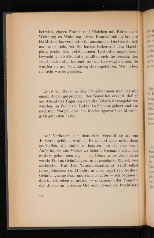 Es ist ein Bauer in den Ort gekommen und hat mit einem Juden gesprochen. Der Bauer hat erzählt, daß er am Abend des Tages, an dem die Geiseln davongefahren wurden, im Wald von Lubianka Schüsse gehört und am nächsten Morgen dort ein frischaufgeworfenes Massengrab gefunden hätte.