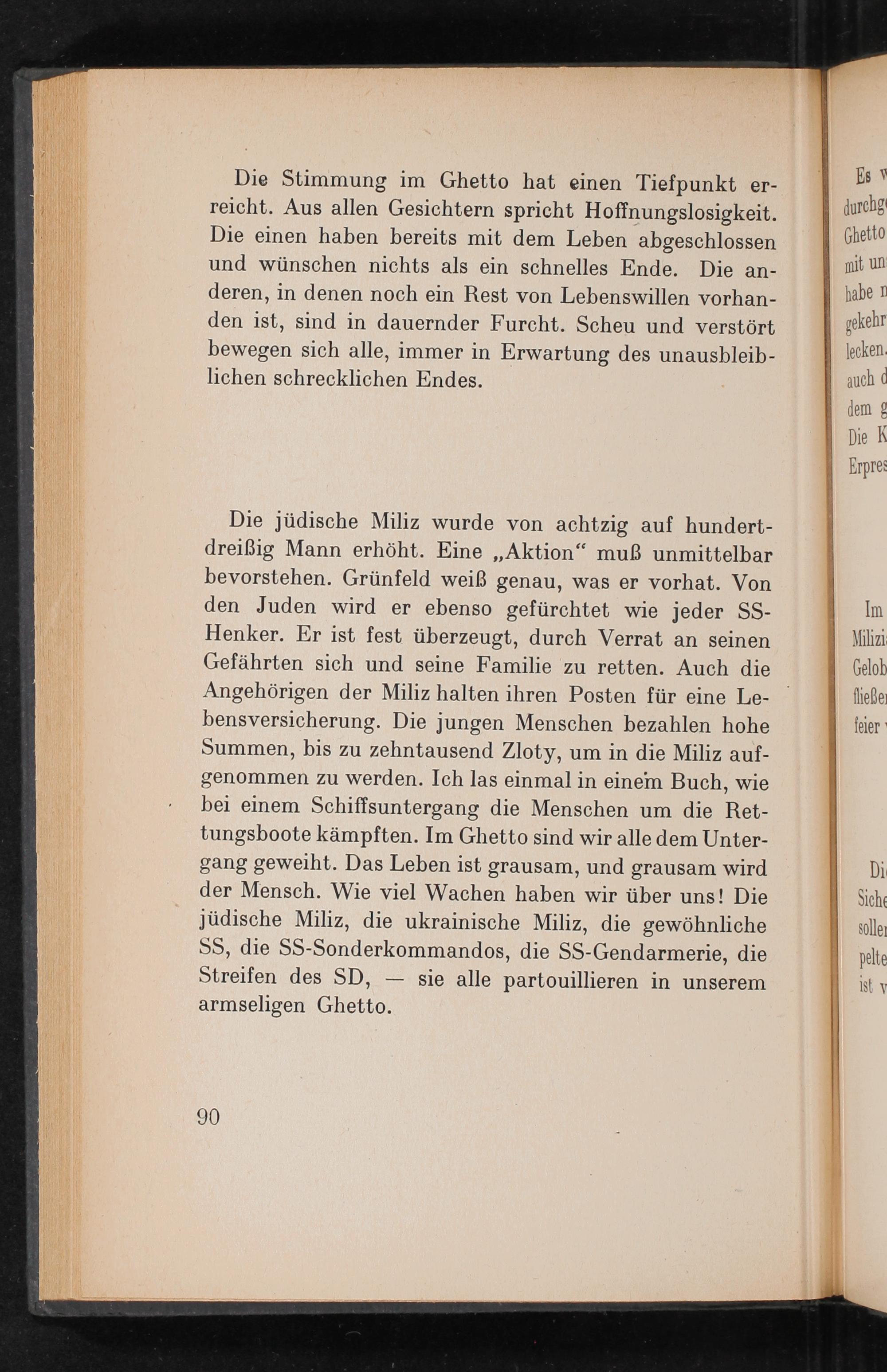Die jüdische Miliz wurde von achtzig auf hundertdreißig Mann erhöht. Eine„ Aktion" muß unmittelbar bevorstehen. Grünfeld weiß genau, was er vorhat. Von den Juden wird er ebenso gefürchtet wie jeder SSHenker. Er ist fest überzeugt, durch Verrat an seinen Gefährten sich und seine Familie zu retten. Auch die Angehörigen der Miliz halten ihren Posten für eine Lebensversicherung. Die jungen Menschen bezahlen hohe Summen, bis zu zehntausend Zloty, um in die Miliz aufgenommen zu werden. Ich las einmal in einem Buch, wie bei einem Schiffsuntergang die Menschen um die Rettungsboote kämpften. Im Ghetto sind wir alle dem Untergang geweiht. Das Leben ist grausam, und grausam wird der Mensch. Wie viel Wachen haben wir über uns! Die jüdische Miliz, die ukrainische Miliz, die gewöhnliche SS, die SS - Sonderkommandos, die SS- Gendarmerie, die Streifen des SD, sie alle partouillieren in unserem armseligen Ghetto.