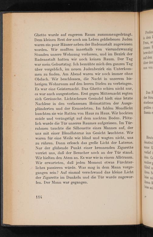 Ghetto wurde auf engerem Raum zusammengedrängt. Dem kleinen Rest der noch am Leben gebliebenen Juden waren ein paar Häuser neben der Badeanstalt zugewiesen worden. Wir mußten innerhalb von vierundzwanzig Stunden unsere Wohnung verlassen, und im Bezirk der Badeanstalt hatten wir noch keinen Raum. Der Tag war mein Geburtstag. Ich bemühte mich den ganzen Tag über vergeblich, im neuen Judenbezirk ein Unterkommen zu finden. Am Abend waren wir noch immer ohne Obdach. Wir beschlossen, die Nacht in unserem bisherigen Wohnraum auf den leeren Dielen zu verbringen. Es war eine Geisternacht. Das Ghetto schien nicht nur, es war auch ausgestorben. Erst gegen Mitternacht regten sich Geräusche. Lichtscheues Gesindel hielt eine letzte Nachlese in den verlassenen Heimstätten der Ausgeplünderten und der Ermordeten. Im fahlen Mondlicht huschten sie wie Ratten von Haus zu Haus. Wir hockten müde und verängstigt auf dem nackten Boden. Plötzlich wurde die Tür unseres Raumes aufgerissen. Im Türrahmen tauchte die Silhouette eines Mannes auf, der uns mit einer Blendlaterne ins Gesicht leuchtete. Wir waren für eine Weile wie blind und wagten nicht, uns zu rühren. Dann erlosch das grelle Licht der Laterne. Nur der glühende Punkt einer brennenden Zigarette verriet uns, daß der Besucher noch an der Tür stand. Wir hielten den Atem an. Es war wie in einem Albtraum. Wir erwarteten, daß jeden Moment etwas Fürchterliches passieren würde. Was mag in dem Mann vorgegangen sein? Auf einmal verschwand das kleine Licht der Zigarette im Dunkeln und die Tür wurde zugeworfen. Der Mann war gegangen.
