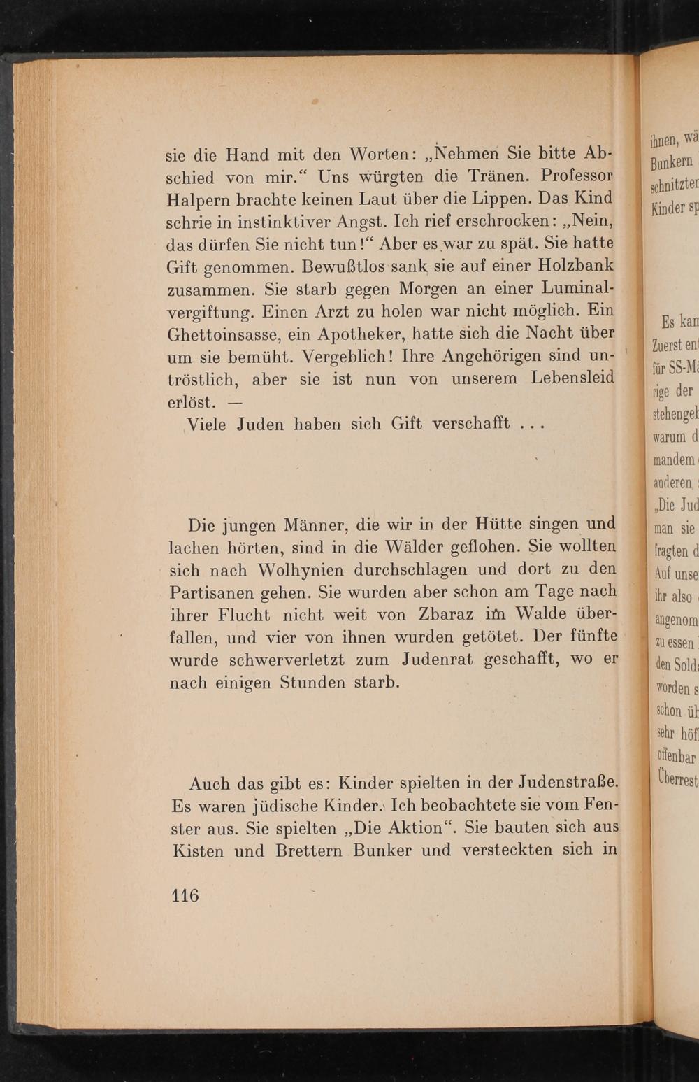 sie die Hand mit den Worten: ,, Nehmen Sie bitte Abschied von mir." Uns würgten die Tränen. Professor Halpern brachte keinen Laut über die Lippen. Das Kind schrie in instinktiver Angst. Ich rief erschrocken: ,, Nein, das dürfen Sie nicht tun!" Aber es war zu spät. Sie hatte Gift genommen. Bewußtlos sank sie auf einer Holzbank zusammen. Sie starb gegen Morgen an einer Luminalvergiftung. Einen Arzt zu holen war nicht möglich. Ein Ghettoinsasse, ein Apotheker, hatte sich die Nacht über um sie bemüht. Vergeblich! Ihre Angehörigen sind untröstlich, aber sie ist nun von unserem Lebensleid erlöst.