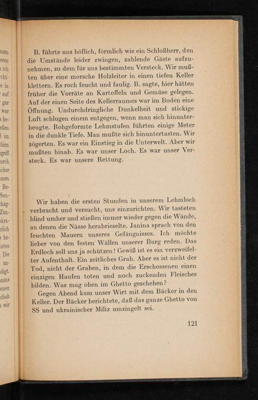B. führte uns höflich, förmlich wie ein Schloßherr, den die Umstände leider zwingen, zahlende Gäste aufzunehmen, zu dem für uns bestimmten Versteck. Wir muẞten über eine morsche Holzleiter in einen tiefen Keller klettern. Es roch feucht und faulig. B. sagte, hier hätten früher die Vorräte an Kartoffeln und Gemüse gelegen. Auf der einen Seite des Kellerraumes war im Boden eine Öffnung. Undurchdringliche Dunkelheit und stickige Luft schlugen einem entgegen, wenn man sich hinunterbeugte. Rohgeformte Lehmstufen führten einige Meter in die dunkle Tiefe. Man mußte sich hinuntertasten. Wir zögerten. Es war ein Einstieg in die Unterwelt. Aber wir mußten hinab. Es war unser Loch. Es war unser Versteck. Es war unsere Rettung.