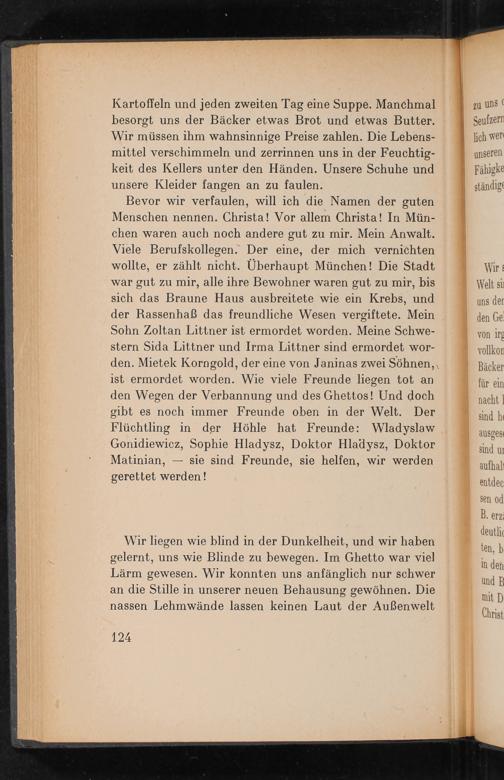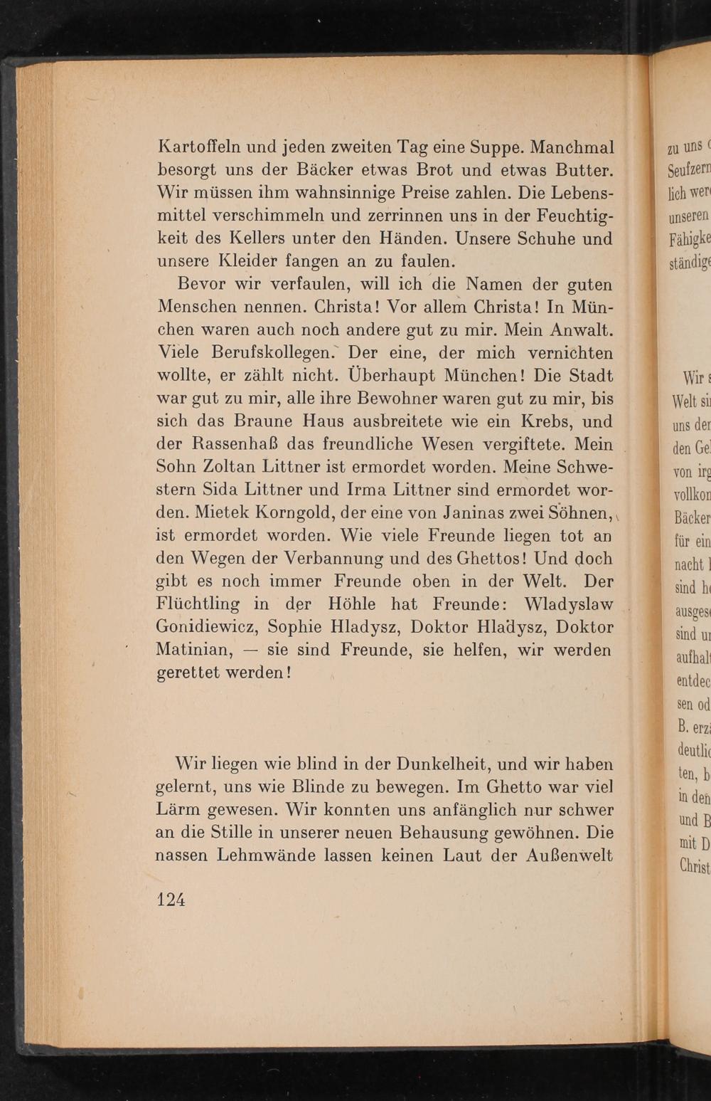 Bevor wir verfaulen, will ich die Namen der guten Menschen nennen. Christa! Vor allem Christa! In München waren auch noch andere gut zu mir. Mein Anwalt. Viele Berufskollegen. Der eine, der mich vernichten wollte, er zählt nicht. Überhaupt München ! Die Stadt war gut zu mir, alle ihre Bewohner waren gut zu mir, bis sich das Braune Haus ausbreitete wie ein Krebs, und der Rassenhaẞ das freundliche Wesen vergiftete. Mein Sohn Zoltan Littner ist ermordet worden. Meine Schwestern Sida Littner und Irma Littner sind ermordet worden. Mietek Korngold, der eine von Janinas zwei Söhnen, ist ermordet worden. Wie viele Freunde liegen tot an den Wegen der Verbannung und des Ghettos! Und doch gibt es noch immer Freunde oben in der Welt. Der Flüchtling in der Höhle hat Freunde: Wladyslaw Gonidiewicz, Sophie Hladysz, Doktor Hladysz, Doktor Matinian, sie sind Freunde, sie helfen, wir werden gerettet werden!