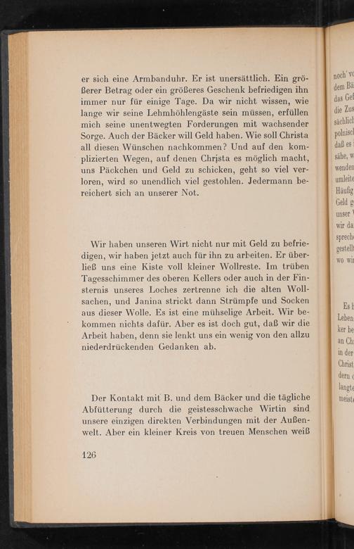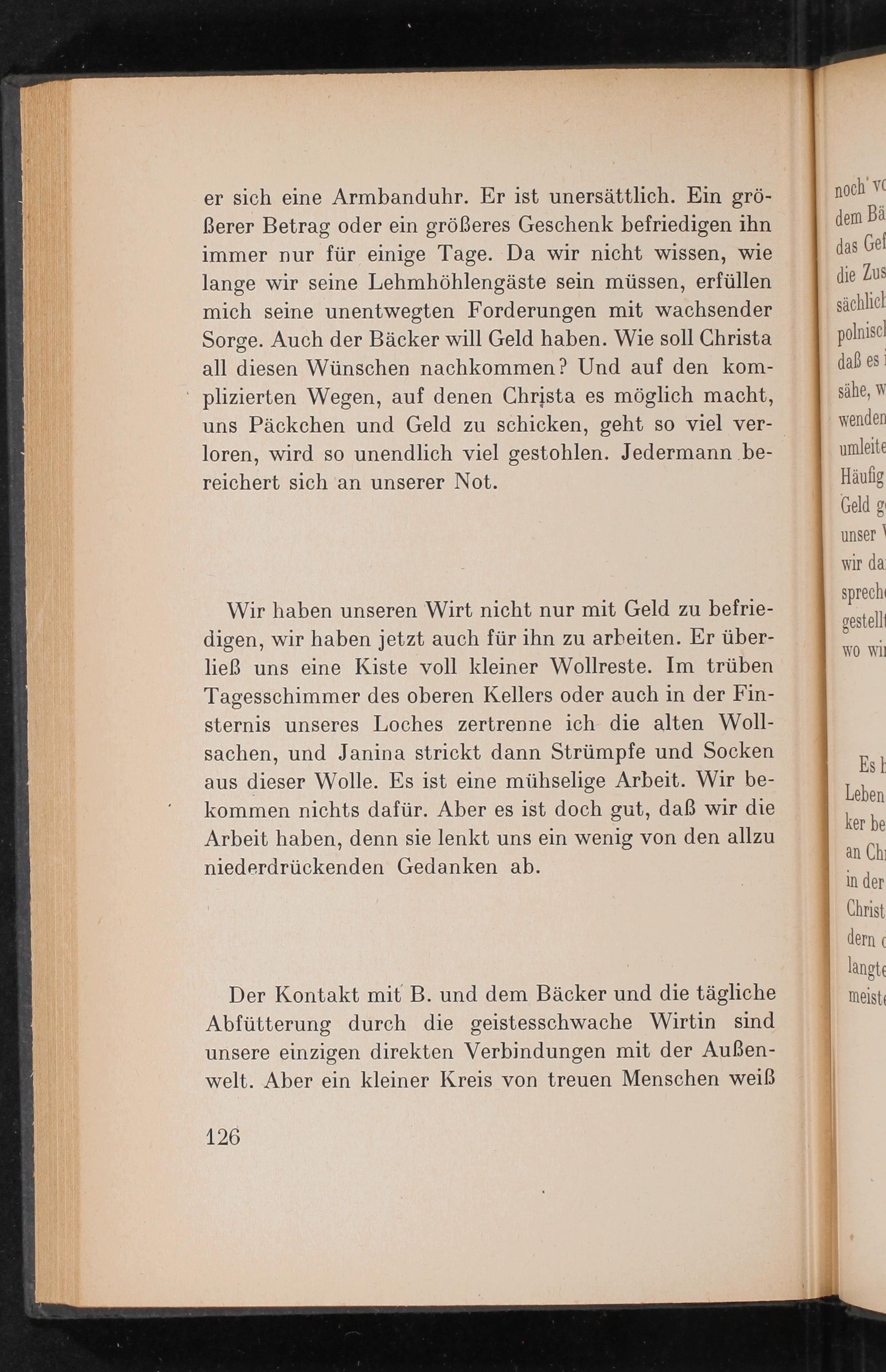 er sich eine Armbanduhr. Er ist unersättlich. Ein gröBerer Betrag oder ein größeres Geschenk befriedigen ihn immer nur für einige Tage. Da wir nicht wissen, wie lange wir seine Lehmhöhlengäste sein müssen, erfüllen mich seine unentwegten Forderungen mit wachsender Sorge. Auch der Bäcker will Geld haben. Wie soll Christa all diesen Wünschen nachkommen? Und auf den komplizierten Wegen, auf denen Christa es möglich macht, uns Päckchen und Geld zu schicken, geht so viel verloren, wird so unendlich viel gestohlen. Jedermann bereichert sich an unserer Not.