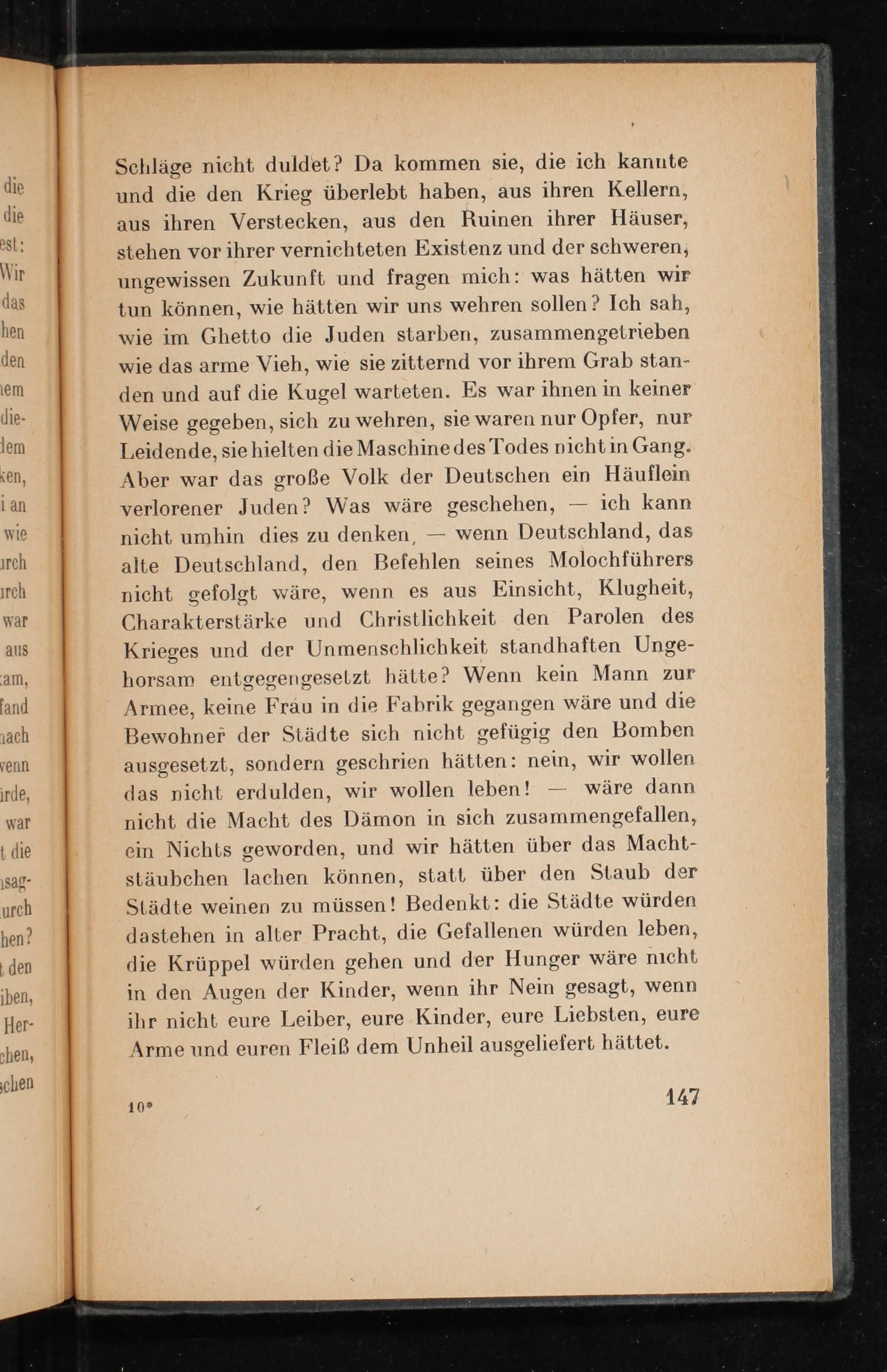 Schläge nicht duldet? Da kommen sie, die ich kannte und die den Krieg überlebt haben, aus ihren Kellern, aus ihren Verstecken, aus den Ruinen ihrer Häuser, stehen vor ihrer vernichteten Existenz und der schweren, ungewissen Zukunft und fragen mich: was hätten wir tun können, wie hätten wir uns wehren sollen? Ich sah, wie im Ghetto die Juden starben, zusammengetrieben wie das arme Vieh, wie sie zitternd vor ihrem Grab stan- den und auf die Kugel warteten. Es war ihnen in keiner Weise gegeben, sich zu wehren, sie waren nur Opfer, nur Leidende, sie hielten die Maschinedes Todes nicht in Gang. Aber war das große Volk der Deutschen ein Häuflein verlorener Juden? Was wäre geschehen,— ich kann nicht umhin dies zu denken,— wenn Deutschland , das alte Deutschland , den Befehlen seines Molochführers nicht gefolgt wäre, wenn es aus Einsicht, Klugheit, Charakterstärke und Christlichkeit den Parolen des Krieges und der Unmenschlichkeit standhaften Unge- horsam entgegengesetzt hätte? Wenn kein Mann zur Armee, keine Frau in die Fabrik gegangen wäre und die Bewohner der Städte sich nicht gefügig den Bomben ausgesetzt, sondern geschrien hätten: nein, wir wollen das nicht erdulden, wir wollen leben!— wäre dann nicht die Macht des Dämon in sich zusammengefallen, ein Nichts geworden, und wir hätten über das Macht- stäubchen lachen können, statt über den Staub der Städte weinen zu müssen! Bedenkt: die Städte würden dastehen in alter Pracht, die Gefallenen würden leben, die Krüppel würden gehen und der Hunger wäre nıcht in den Augen der Kinder, wenn ihr Nein gesagt, wenn ihr nicht eure Leiber, eure Kinder, eure Liebsten, eure Arme und euren Fleiß dem Unheil ausgeliefert hättet.