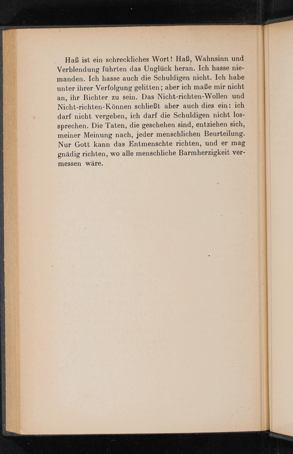 Haß ist ein schreckliches Wort! Haß, Wahnsinn und Verblendung führten das Unglück heran. Ich hasse niemanden. Ich hasse auch die Schuldigen nicht. Ich habe unter ihrer Verfolgung gelitten; aber ich maße mir nicht an, ihr Richter zu sein. Das Nicht- richten- Wollen und Nicht- richten- Können schließt aber auch dies ein: ich darf nicht vergeben, ich darf die Schuldigen nicht lossprechen. Die Taten, die geschehen sind, entziehen sich, meiner Meinung nach, jeder menschlichen Beurteilung. Nur Gott kann das Entmenschte richten, und er mag gnädig richten, wo alle menschliche Barmherzigkeit ver