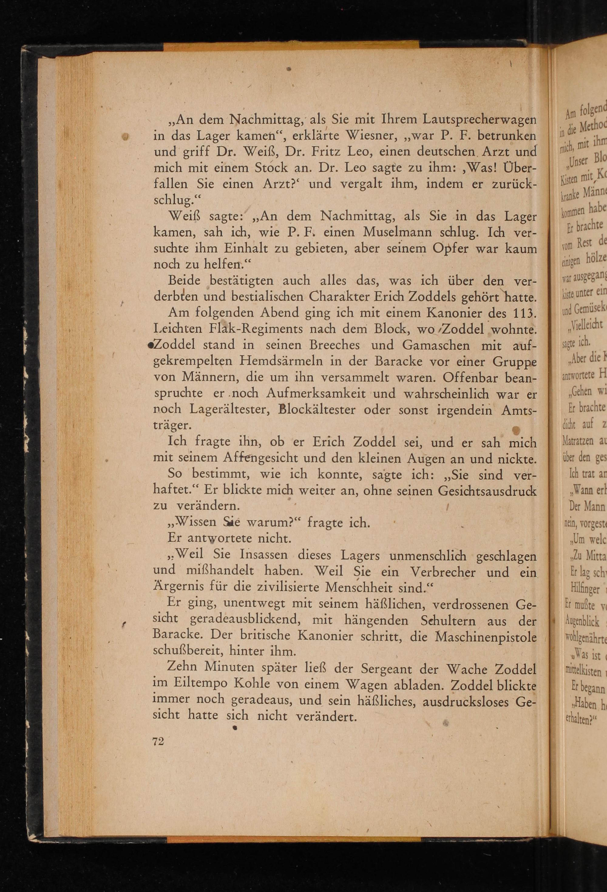 Beide bestätigten auch alles das, was ich über den verderbten und bestialischen Charakter Erich Zoddels gehört hatte. Am folgenden Abend ging ich mit einem Kanonier des 113. Leichten Flak- Regiments nach dem Block, wo Zoddel wohnte. Zoddel stand in seinen Breeches und Gamaschen mit aufgekrempelten Hemdsärmeln in der Baracke vor einer Gruppe von Männern, die um ihn versammelt waren. Offenbar beanspruchte er noch Aufmerksamkeit und wahrscheinlich war er noch Lagerältester, Blockältester oder sonst irgendein Amtsträger.
