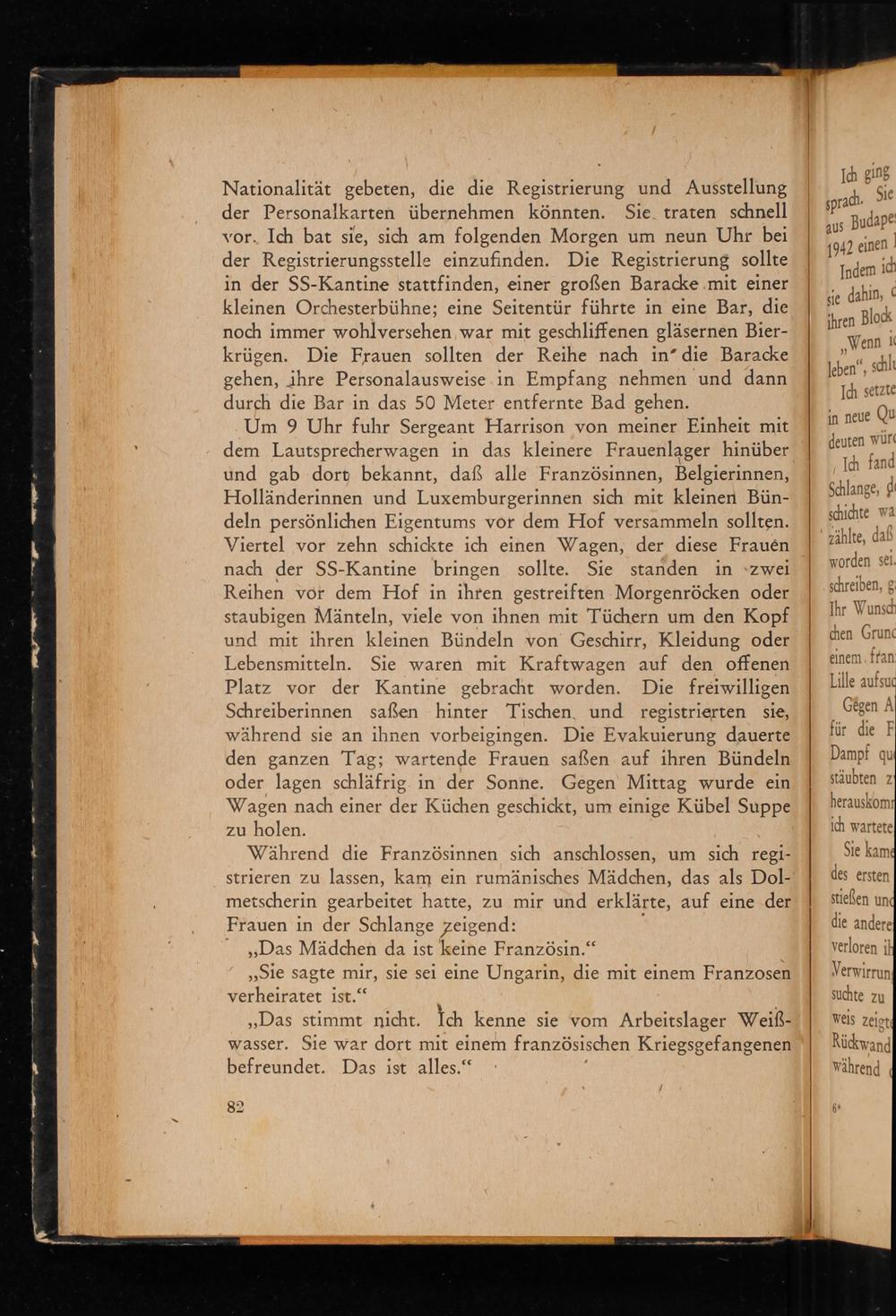 Nationalität gebeten, die die Registrierung und Ausstellung der Personalkarten übernehmen könnten. Sie traten schnell vor. Ich bat sie, sich am folgenden Morgen um neun Uhr bei der Registrierungsstelle einzufinden. Die Registrierung sollte in der SS - Kantine stattfinden, einer großen Baracke mit einer kleinen Orchesterbühne; eine Seitentür führte in eine Bar, die noch immer wohlversehen war mit geschliffenen gläsernen Bierkrügen. Die Frauen sollten der Reihe nach in die Baracke gehen, ihre Personalausweise in Empfang nehmen und dann durch die Bar in das 50 Meter entfernte Bad gehen.