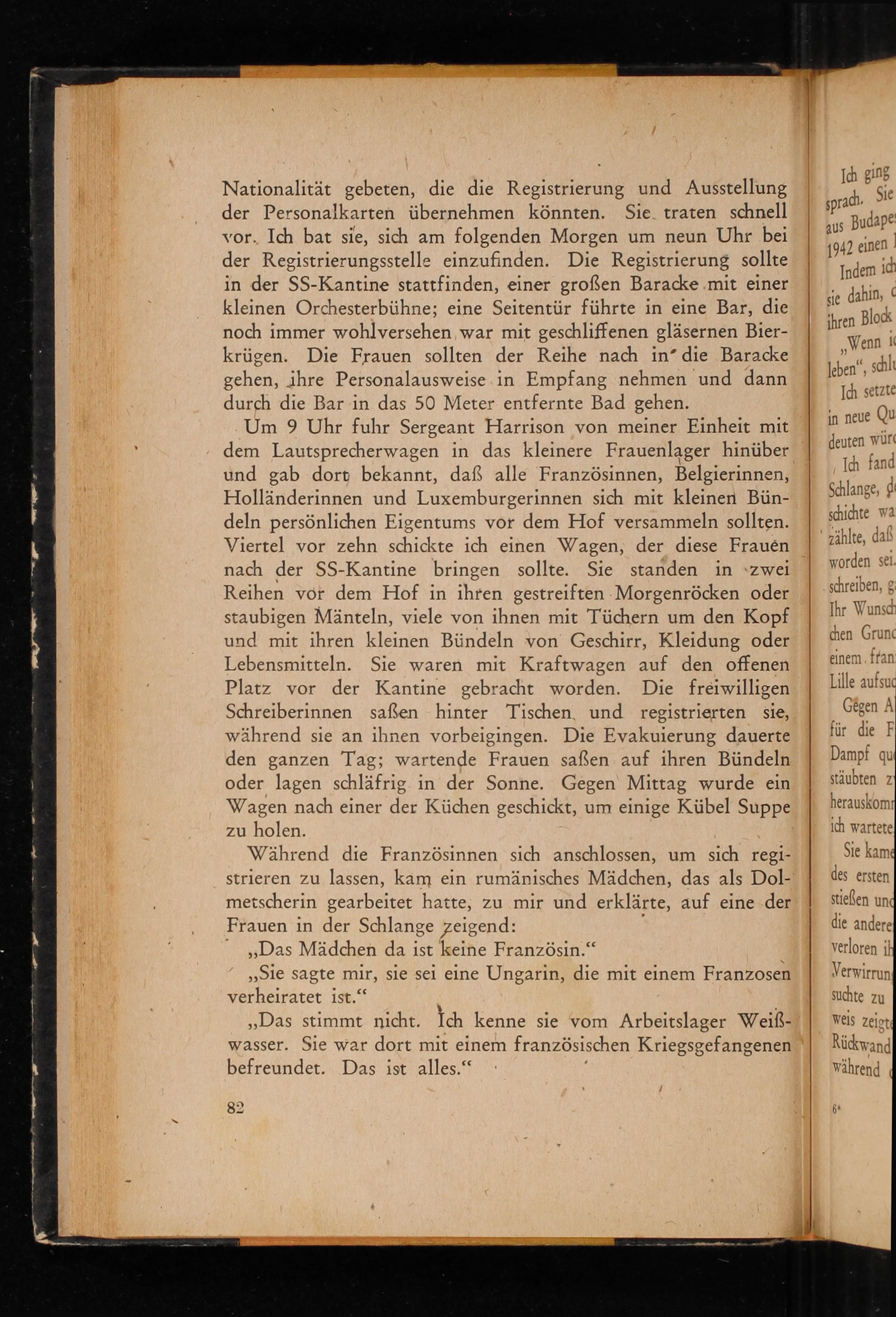 Um 9 Uhr fuhr Sergeant Harrison von meiner Einheit mit dem Lautsprecherwagen in das kleinere Frauenlager hinüber und gab dort bekannt, daß alle Französinnen, Belgierinnen, Holländerinnen und Luxemburgerinnen sich mit kleinen Bündeln persönlichen Eigentums vor dem Hof versammeln sollten. Viertel vor zehn schickte ich einen Wagen, der diese Frauen nach der SS - Kantine bringen sollte. Sie standen in zwei Reihen vor dem Hof in ihren gestreiften Morgenröcken oder staubigen Mänteln, viele von ihnen mit Tüchern um den Kopf und mit ihren kleinen Bündeln von Geschirr, Kleidung oder Lebensmitteln. Sie waren mit Kraftwagen auf den offenen Platz vor der Kantine gebracht worden. Die freiwilligen Schreiberinnen saßen hinter Tischen, und registrierten sie, während sie an ihnen vorbeigingen. Die Evakuierung dauerte den ganzen Tag; wartende Frauen saßen auf ihren Bündeln oder lagen schläfrig in der Sonne. Gegen Mittag wurde ein Wagen nach einer der Küchen geschickt, um einige Kübel Suppe zu holen.