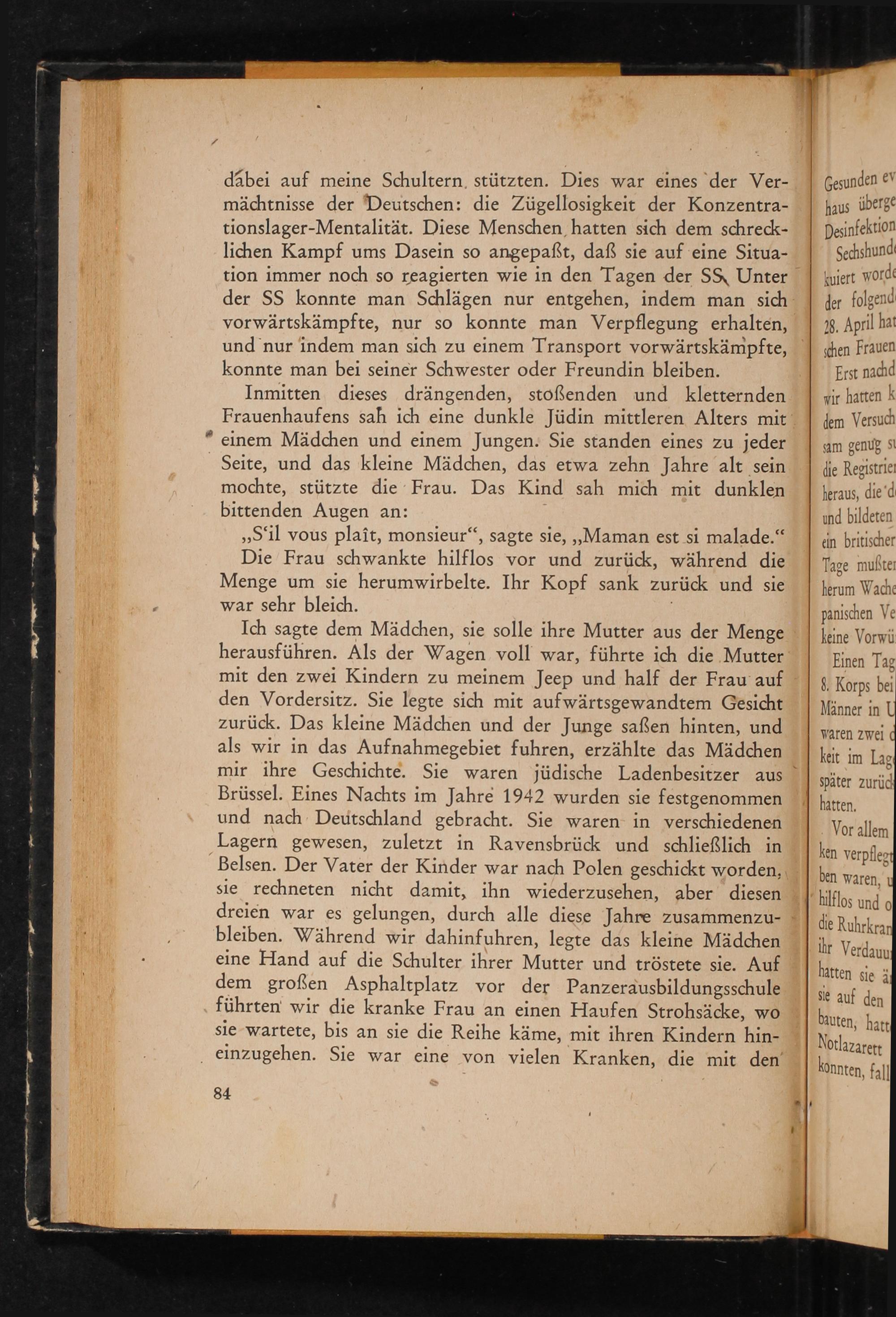 Ich sagte dem Mädchen, sie solle ihre Mutter aus der Menge herausführen. Als der Wagen voll war, führte ich die Mutter mit den zwei Kindern zu meinem Jeep und half der Frau auf den Vordersitz. Sie legte sich mit aufwärtsgewandtem Gesicht zurück. Das kleine Mädchen und der Junge saßen hinten, und als wir in das Aufnahmegebiet fuhren, erzählte das Mädchen mir ihre Geschichte. Sie waren jüdische Ladenbesitzer aus Brüssel . Eines Nachts im Jahre 1942 wurden sie festgenommen und nach Deutschland gebracht. Sie waren in verschiedenen Lagern gewesen, zuletzt in Ravensbrück und schließlich in Belsen. Der Vater der Kinder war nach Polen geschickt worden, sie rechneten nicht damit, ihn wiederzusehen, aber diesen dreien war es gelungen, durch alle diese Jahre zusammenzubleiben. Während wir dahinfuhren, legte das kleine Mädchen eine Hand auf die Schulter ihrer Mutter und tröstete sie. Auf dem großen Asphaltplatz vor der Panzerausbildungsschule führten wir die kranke Frau an einen Haufen Strohsäcke, wo sie wartete, bis an sie die Reihe käme, mit ihren Kindern hineinzugehen. Sie war eine von vielen Kranken, die mit den