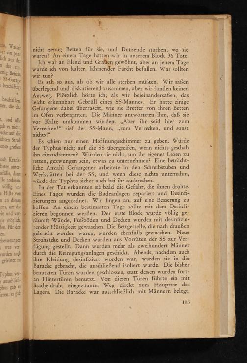 In der Tat erkannten sie bald die Gefahr, die ihnen drohte. Eines Tages wurden die Badeanlagen repariert und Desinfizierungen angeordnet. Wir fingen an, auf eine Besserung zu hoffen. An einem bestimmten Tage sollte mit dem Desinfizieren begonnen werden. Der erste Block wurde völlig geräumt; Wände, Fußböden und Decken wurden mit desinfizierender Flüssigkeit gewaschen. Die Bettgestelle, die nach draußen gebracht worden waren, wurden ebenfalls gewaschen. Neue Strohsäcke und Decken wurden aus Vorräten der SS zur Verfügung gestellt. Dann wurden mehr als zweihundert Männer durch die Reinigungsanlagen geschickt. Abends, nachdem auch ihre Kleidung desinfiziert worden war, wurden sie in die Baracke gebracht, die anschließend isoliert wurde. Die bisher benutzten Türen wurden geschlossen, statt dessen wurden fortan Hintertüren benutzt. Von diesen Türen führte ein mit Stacheldraht eingezäunter Weg direkt zum Haupttor des Lagers. Die Baracke war ausschließlich mit Männern belegt,