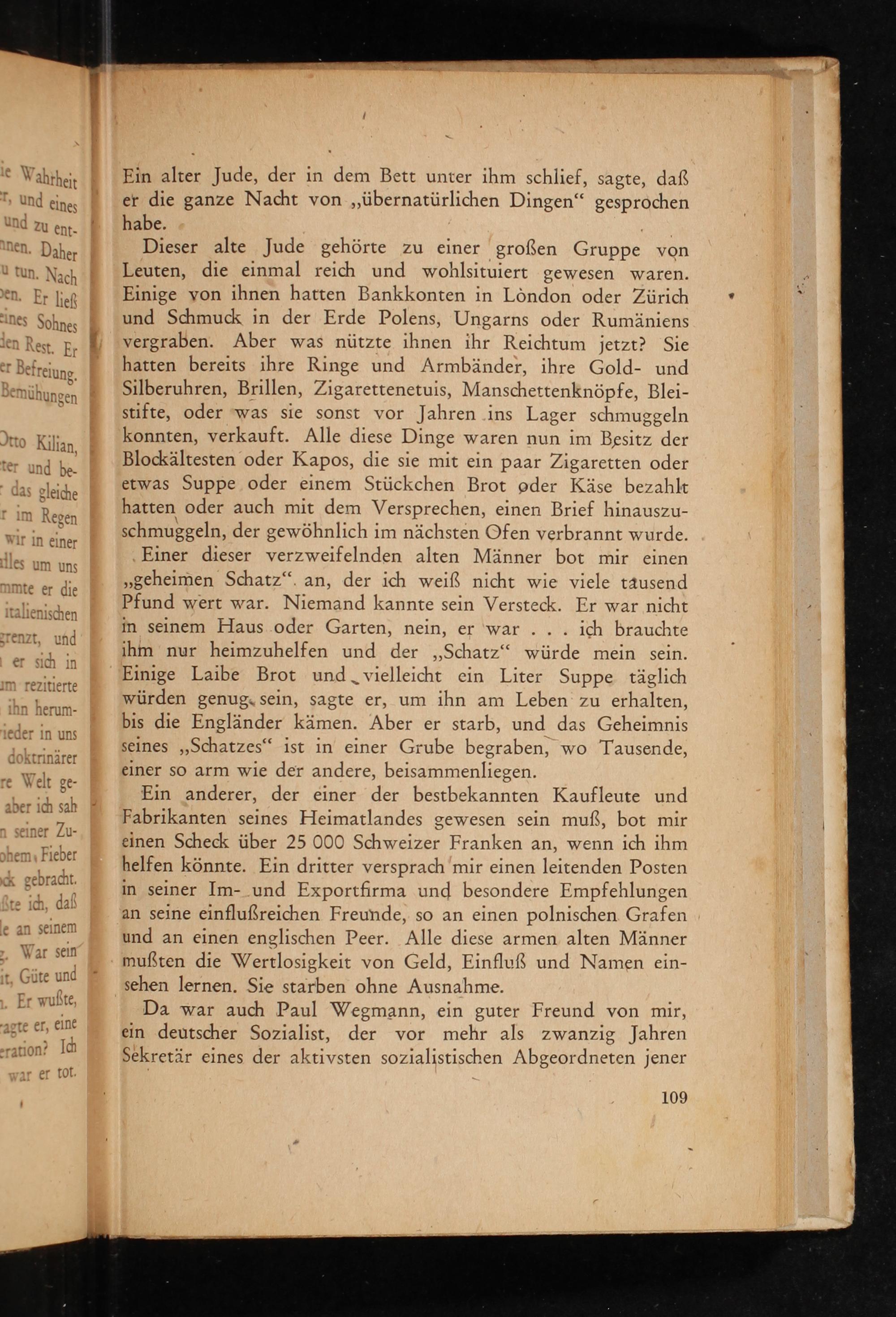Dieser alte Jude gehörte zu einer großen Gruppe von Leuten, die einmal reich und wohlsituiert gewesen waren. Einige von ihnen hatten Bankkonten in London oder Zürich und Schmuck in der Erde Polens, Ungarns oder Rumäniens vergraben. Aber was nützte ihnen ihr Reichtum jetzt? Sie hatten bereits ihre Ringe und Armbänder, ihre Gold- und Silberuhren, Brillen, Zigarettenetuis, Manschettenknöpfe, Bleistifte, oder was sie sonst vor Jahren ins Lager schmuggeln konnten, verkauft. Alle diese Dinge waren nun im Besitz der Blockältesten oder Kapos, die sie mit ein paar Zigaretten oder etwas Suppe oder einem Stückchen Brot oder Käse bezahlt hatten oder auch mit dem Versprechen, einen Brief hinauszuschmuggeln, der gewöhnlich im nächsten Ofen verbrannt wurde. Einer dieser verzweifelnden alten Männer bot mir einen ,, geheimen Schatz" an, der ich weiß nicht wie viele tausend Pfund wert war. Niemand kannte sein Versteck. Er war nicht in seinem Haus oder Garten, nein, er war... ich brauchte ihm nur heimzuhelfen und der ,, Schatz" würde mein sein. Einige Laibe Brot und vielleicht ein Liter Suppe täglich würden genug, sein, sagte er, um ihn am Leben zu erhalten, bis die Engländer kämen. Aber er starb, und das Geheimnis seines ,, Schatzes" ist in einer Grube begraben, wo Tausende, einer so arm wie der andere, beisammenliegen.