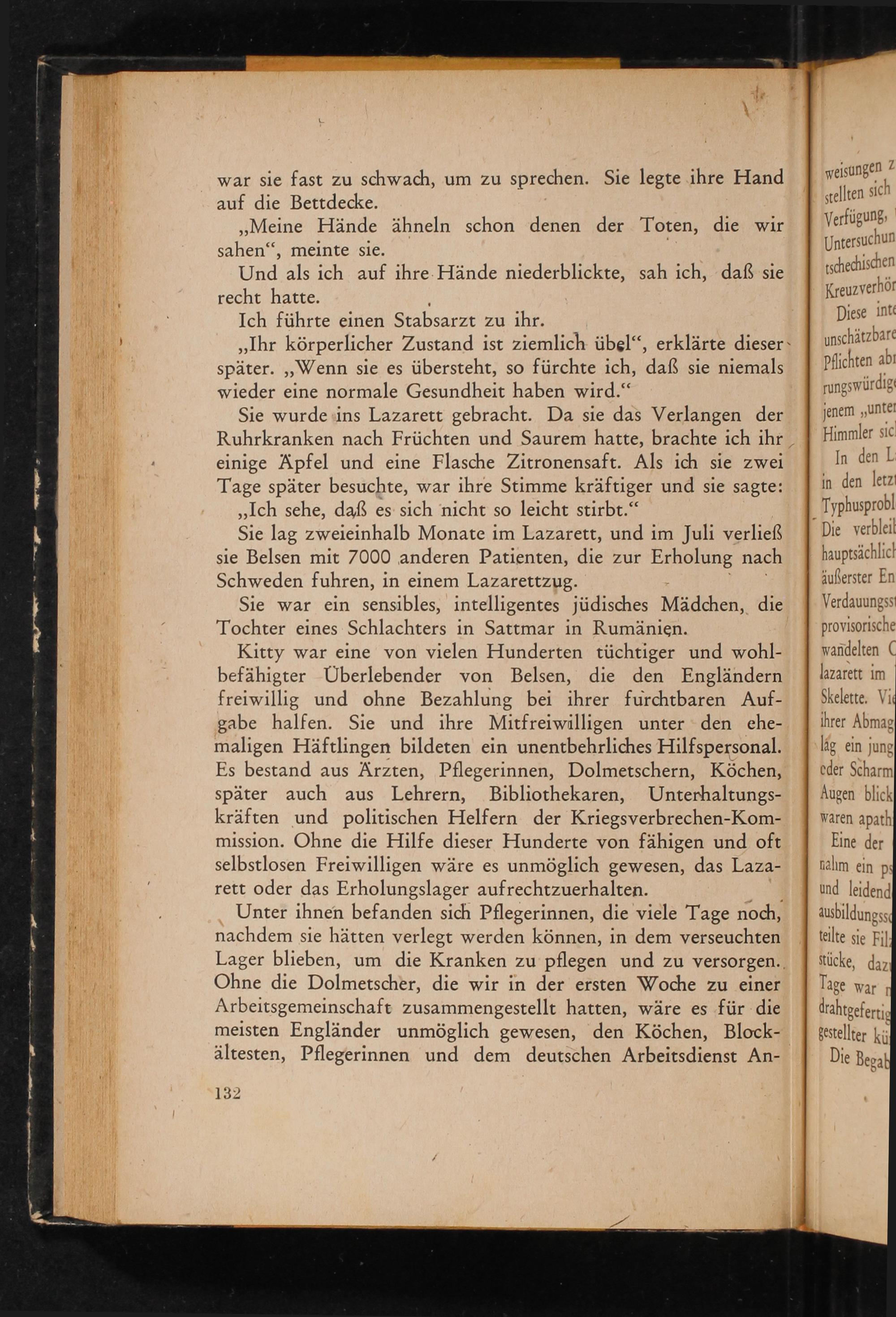 Kitty war eine von vielen Hunderten tüchtiger und wohlbefähigter Überlebender von Belsen, die den Engländern freiwillig und ohne Bezahlung bei ihrer furchtbaren Aufgabe halfen. Sie und ihre Mitfreiwilligen unter den ehemaligen Häftlingen bildeten ein unentbehrliches Hilfspersonal. Es bestand aus Ärzten, Pflegerinnen, Dolmetschern, Köchen, später auch aus Lehrern, Bibliothekaren, Unterhaltungskräften und politischen Helfern der Kriegsverbrechen- Kommission. Ohne die Hilfe dieser Hunderte von fähigen und oft selbstlosen Freiwilligen wäre es unmöglich gewesen, das Lazarett oder das Erholungslager aufrechtzuerhalten.