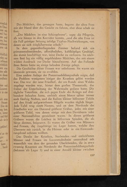 Eine andere Anlage der Panzerausbildungsschule zeigte, daß das Problem wenigstens einiger der Kranken gelöst worden war. Das war der neue Friedhof, der am Rande eines Waldes angelegt worden war, hinter dem großen Theaterzelt, das früher der Unterhaltung der Wehrmacht gedient hatte. Die tägliche Totenliste, die sich gegen Ende des Krieges auf dreihundert belaufen hatte, enthielt einen Monat später immer noch fünfzig Namen, und die Reihen kleiner hölzerner Tafeln auf den frisch aufgeworfenen Hügeln wurden täglich länger. Jede Tafel trug eineh Namen, und an dem Nordende des Friedhofes war ein Dutzend größerer Gräber, jedes mit einer größeren Tafel, von denen einige mit dem Davidstern oder einer Nationalfahne gezeichnet waren. In diesen größeren Gräbern waren die Leichen in hölzernen Spinden, die als Särge dienten, beigesetzt. Es waren die Gräber von Männern und Frauen, die Angehörige im Lager hatten, welche ihre Überreste mit zurück in die Heimat oder in ein Einwanderungsland nehmen wollten.
