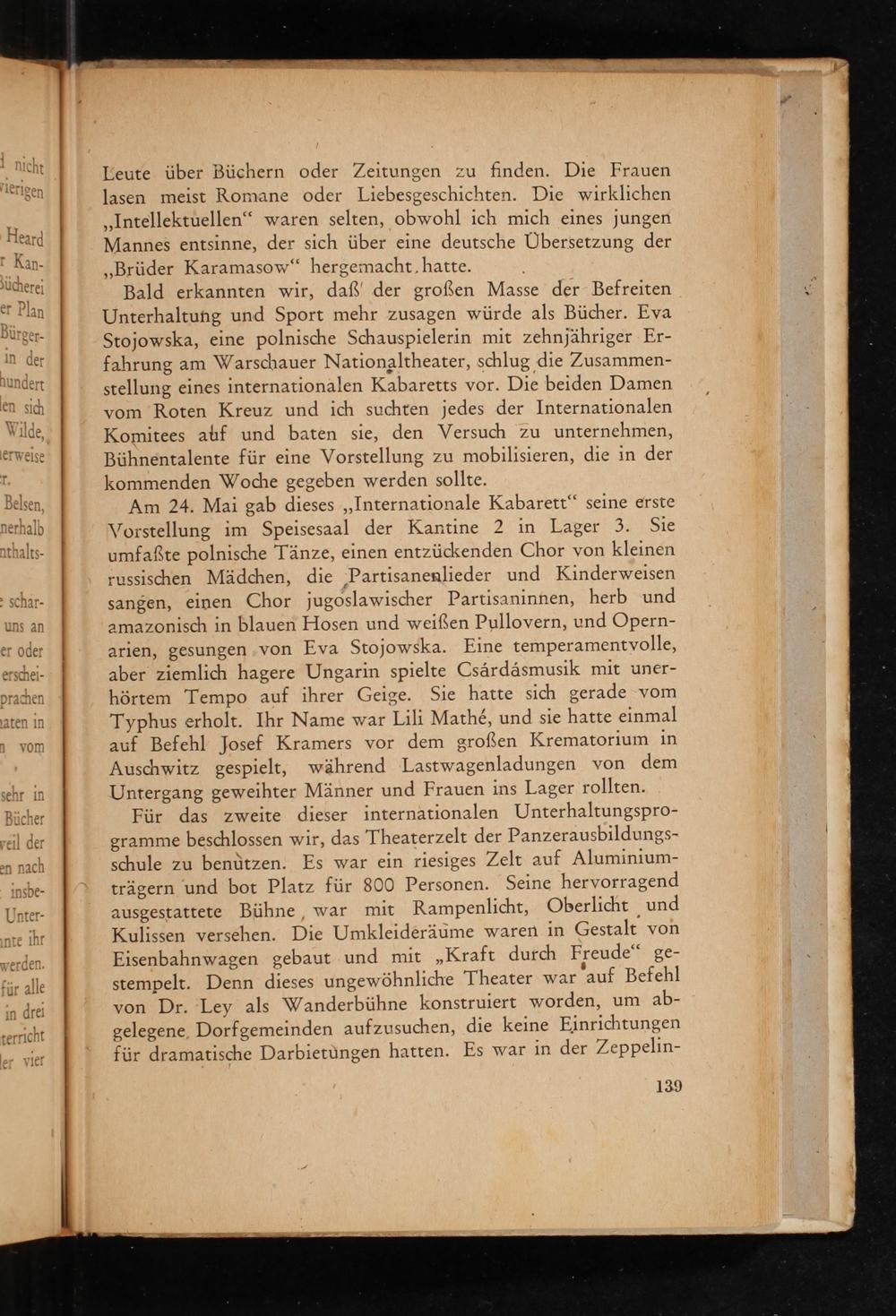 Am 24. Mai gab dieses ,, Internationale Kabarett" seine erste Vorstellung im Speisesaal der Kantine 2 in Lager 3. Sie umfaßte polnische Tänze, einen entzückenden Chor von kleinen russischen Mädchen, die Partisanenlieder und Kinderweisen sangen, einen Chor jugoslawischer Partisaninnen, herb und amazonisch in blauen Hosen und weißen Pullovern, und Opernarien, gesungen von Eva Stojowska. Eine temperamentvolle, aber ziemlich hagere Ungarin spielte Csárdásmusik mit unerhörtem Tempo auf ihrer Geige. Sie hatte sich gerade vom Typhus erholt. Ihr Name war Lili Mathé, und sie hatte einmal auf Befehl Josef Kramers vor dem großen Krematorium in Auschwitz gespielt, während Lastwagenladungen von dem Untergang geweihter Männer und Frauen ins Lager rollten.