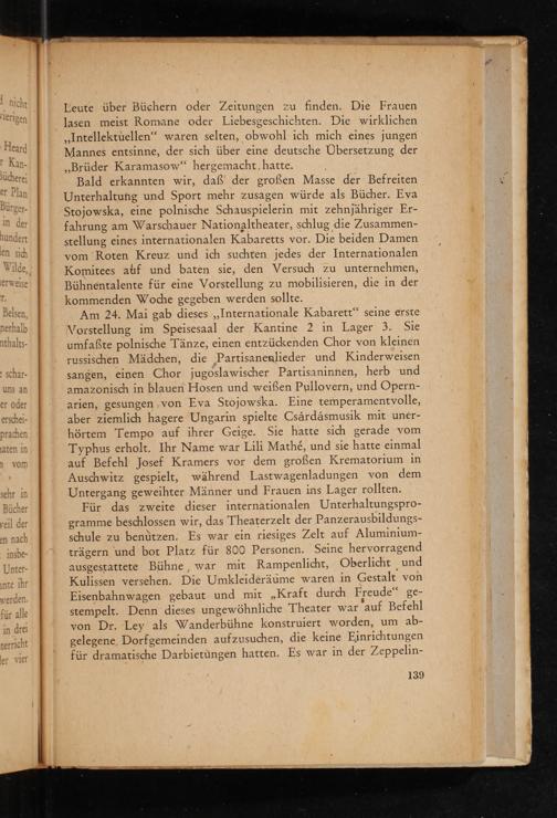 Bald erkannten wir, daß der großen Masse der Befreiten Unterhaltung und Sport mehr zusagen würde als Bücher. Eva Stojowska, eine polnische Schauspielerin mit zehnjähriger Erfahrung am Warschauer Nationaltheater, schlug die Zusammenstellung eines internationalen Kabaretts vor. Die beiden Damen vom Roten Kreuz und ich suchten jedes der Internationalen Komitees auf und baten sie, den Versuch zu unternehmen, Bühnentalente für eine Vorstellung zu mobilisieren, die in der kommenden Woche gegeben werden sollte.