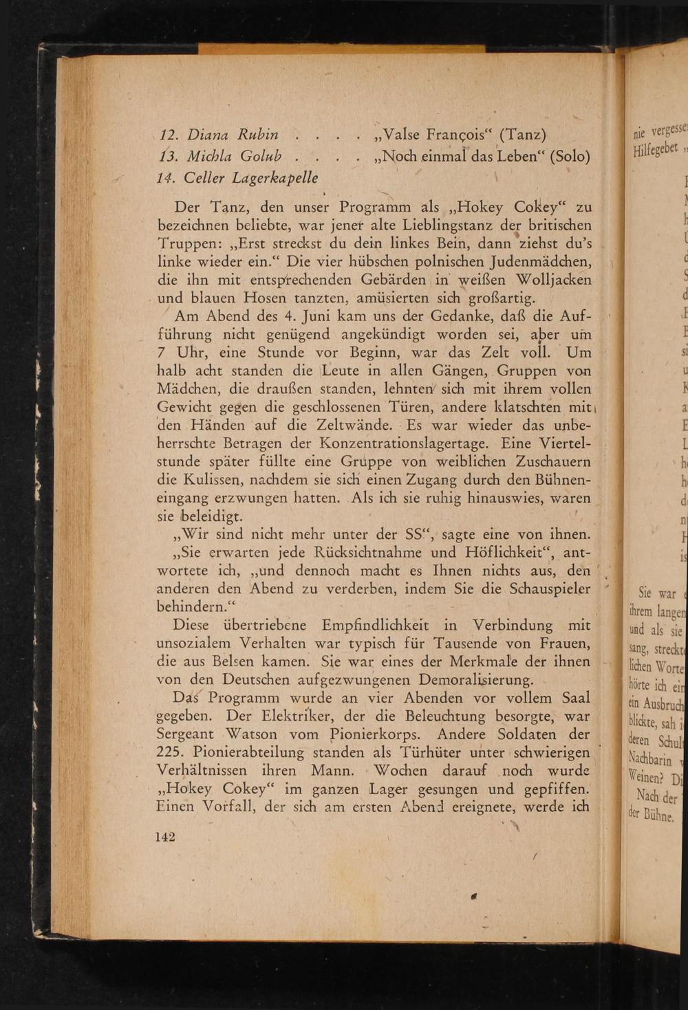 Am Abend des 4. Juni kam uns der Gedanke, daß die Aufführung nicht genügend angekündigt worden sei, aber um 7 Uhr, eine Stunde vor Beginn, war das Zelt voll. Um halb acht standen die Leute in allen Gängen, Gruppen von Mädchen, die draußen standen, lehnten sich mit ihrem vollen Gewicht gegen die geschlossenen Türen, andere klatschten mit den Händen auf die Zeltwände. Es war wieder das unbeherrschte Betragen der Konzentrationslagertage. Eine Viertelstunde später füllte eine Gruppe von weiblichen Zuschauern die Kulissen, nachdem sie sich einen Zugang durch den Bühneneingang erzwungen hatten. Als ich sie ruhig hinauswies, waren sie beleidigt.