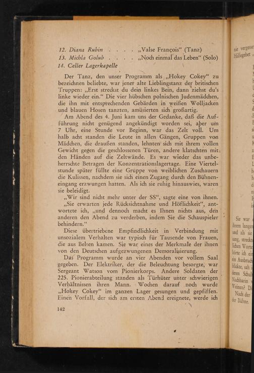 , Wir sind nicht mehr unter der SS ", sagte eine von ihnen. ,, Sie erwarten jede Rücksichtnahme und Höflichkeit", antwortete ich ,,, und dennoch macht es Ihnen nichts aus, den anderen den Abend zu verderben, indem Sie die Schauspieler behindern."
