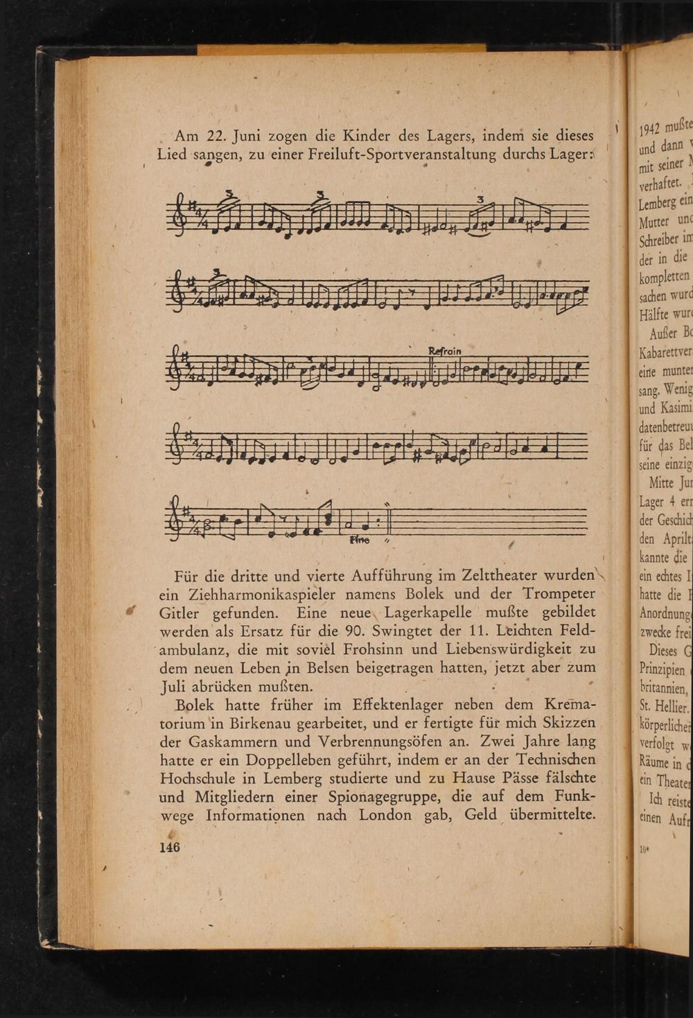 Für die dritte und vierte Aufführung im Zelttheater wurden\ ein Ziehharmonikaspieler namens Bolek und der Trompeter Gitler gefunden. Eine neue Lagerkapelle mußte gebildet werden als Ersatz für die 90. Swingtet der 11. Leichten Feld­ambulanz, die mit soviel Frohsinn und Liebenswürdigkeit zu dem neuen Leben in Belsen beigetragen hatten, jetzt aber zum Juli abrücken mußten.