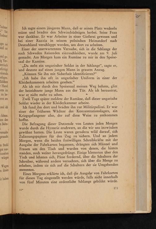 Die Befragung dieser Dutzende von Leuten jeden Morgen wurde durch die Hysterie erschwert, an die wir uns inzwischen gewöhnt hatten. Die Leute waren geradezu wild darauf, sich Zulassungspapiere für den‘Zug zu sichern. Und an jedem Morgen, wenn die beiden freiwilligen Schreibkräfte mit der Ausgabe der Fahrkarten begannen, drängten sich Männer und Frauen um den Tisch und wurden von denen,.die hinten standen, noch weiter herangedrängt. Einige kletterten über den Tisch und lehnten sich, Pässe fordernd, über die Schultern der Schreiber, während andere versuchten, sich über die Menge zu