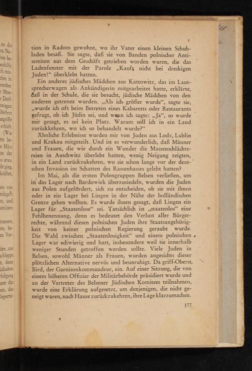 Ein anderes jüdisches Mädchen aus Kattowitz , das im Laut- sprecherwagen als Ankündigerin mitgearbeitet hatte, erklärte, daß in der Schule, die sie besucht, jüdische Mädchen von den anderen getrennt wurden.„Als ich größer wurde“, sagte sie, „wurde ich oft beim Betreten eines Kabaretts oder Restaurants gefragt, ob ich Jüdin sei, und wenn ich sagte:„Ja“, so wurde mir gesagt, es sei kein Platz. Warum soll ich in ein Land zurückkehren, wo ich so behandelt wurde?“