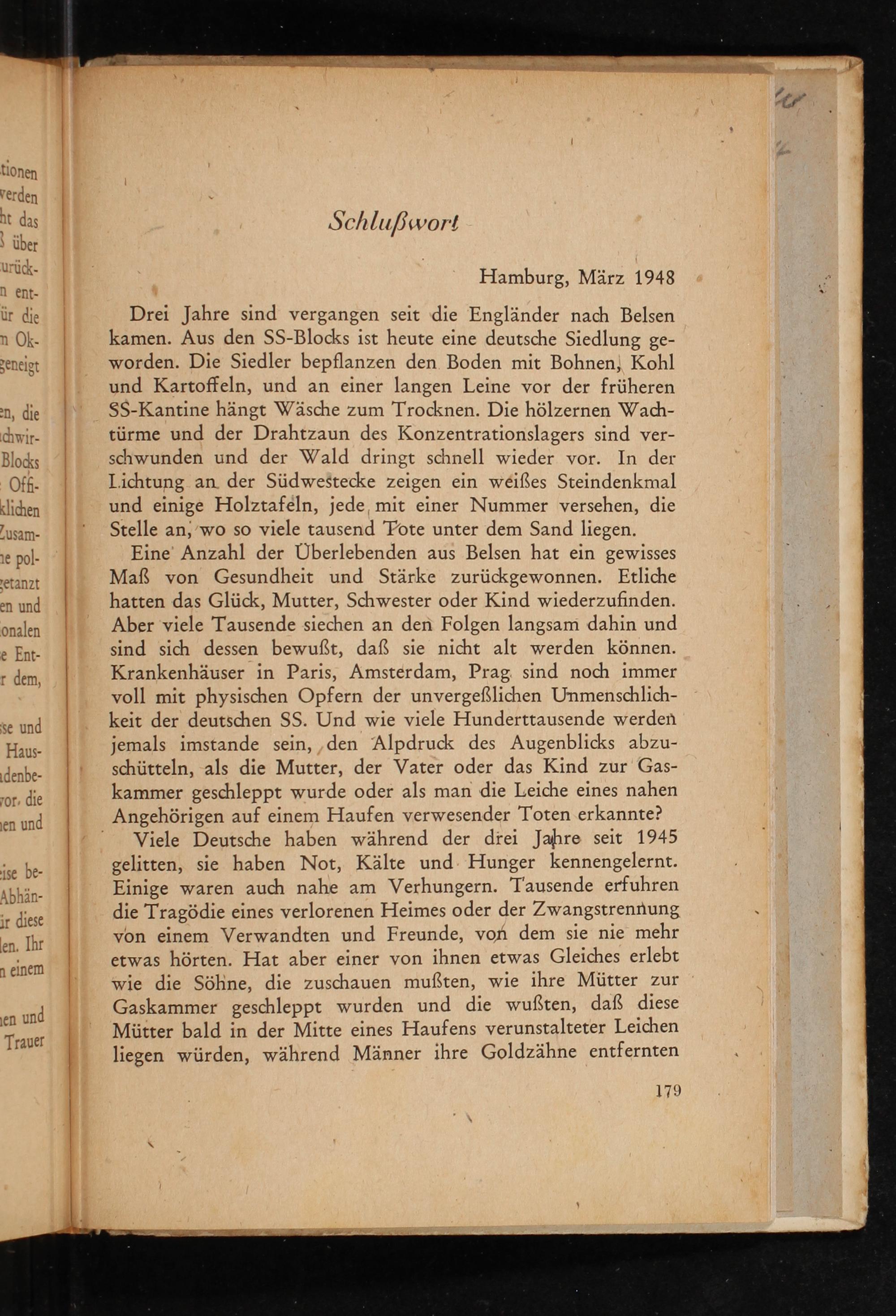 Eine Anzahl der Überlebenden aus Belsen hat ein gewisses Maß von Gesundheit und Stärke zurückgewonnen. Etliche hatten das Glück, Mutter, Schwester oder Kind wiederzufinden. Aber viele Tausende siechen an den Folgen langsam dahin und sind sich dessen bewußt, daß sie nicht alt werden können. Krankenhäuser in Paris, Amsterdam, Prag sind noch immer voll mit physischen Opfern der unvergeßlichen Unmenschlichkeit der deutschen SS. Und wie viele Hunderttausende werden jemals imstande sein, den Alpdruck des Augenblicks abzuschütteln, als die Mutter, der Vater oder das Kind zur Gaskammer geschleppt wurde oder als man die Leiche eines nahen Angehörigen auf einem Haufen verwesender Toten erkannte? Viele Deutsche haben während der drei Jahre seit 1945 gelitten, sie haben Not, Kälte und Hunger kennengelernt. Einige waren auch nahe am Verhungern. Tausende erfuhren die Tragödie eines verlorenen Heimes oder der Zwangstrennung von einem Verwandten und Freunde, von dem sie nie mehr etwas hörten. Hat aber einer von ihnen etwas Gleiches erlebt wie die Söhne, die zuschauen mußten, wie ihre Mütter zur Gaskammer geschleppt wurden und die wußten, daß diese Mütter bald in der Mitte eines Haufens verunstalteter Leichen liegen würden, während Männer ihre Goldzähne entfernten