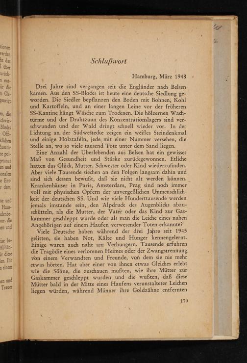 Drei Jahre sind vergangen seit die Engländer nach Belsen kamen. Aus den SS - Blocks ist heute eine deutsche Siedlung geworden. Die Siedler bepflanzen den Boden mit Bohnen, Kohl und Kartoffeln, und an einer langen Leine vor der früheren SS - Kantine hängt Wäsche zum Trocknen. Die hölzernen Wachtürme und der Drahtzaun des Konzentrationslagers sind verschwunden und der Wald dringt schnell wieder vor. In der Lichtung an der Südwestecke zeigen ein weißes Steindenkmal und einige Holztafeln, jede, mit einer Nummer versehen, die Stelle an, wo so viele tausend Tote unter dem Sand liegen.