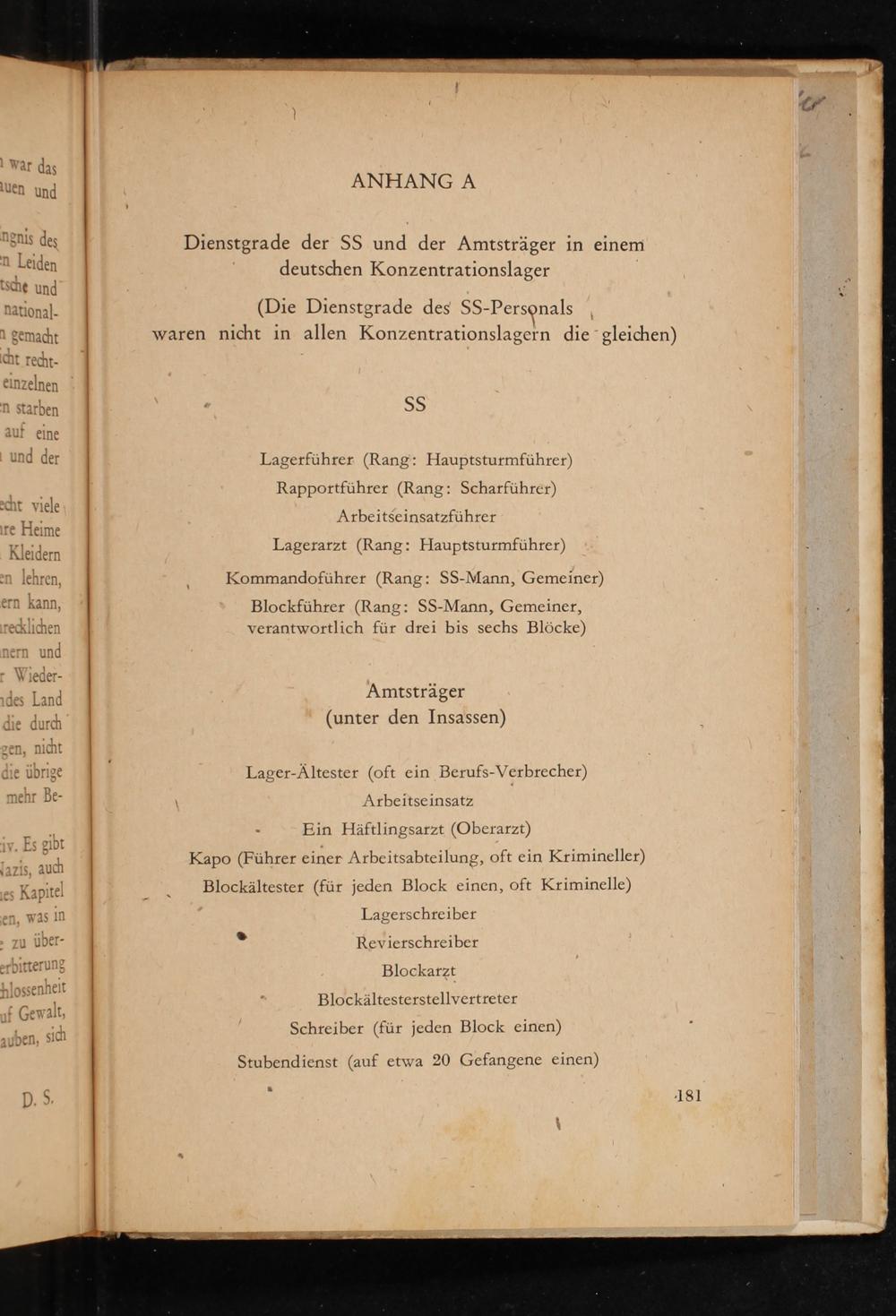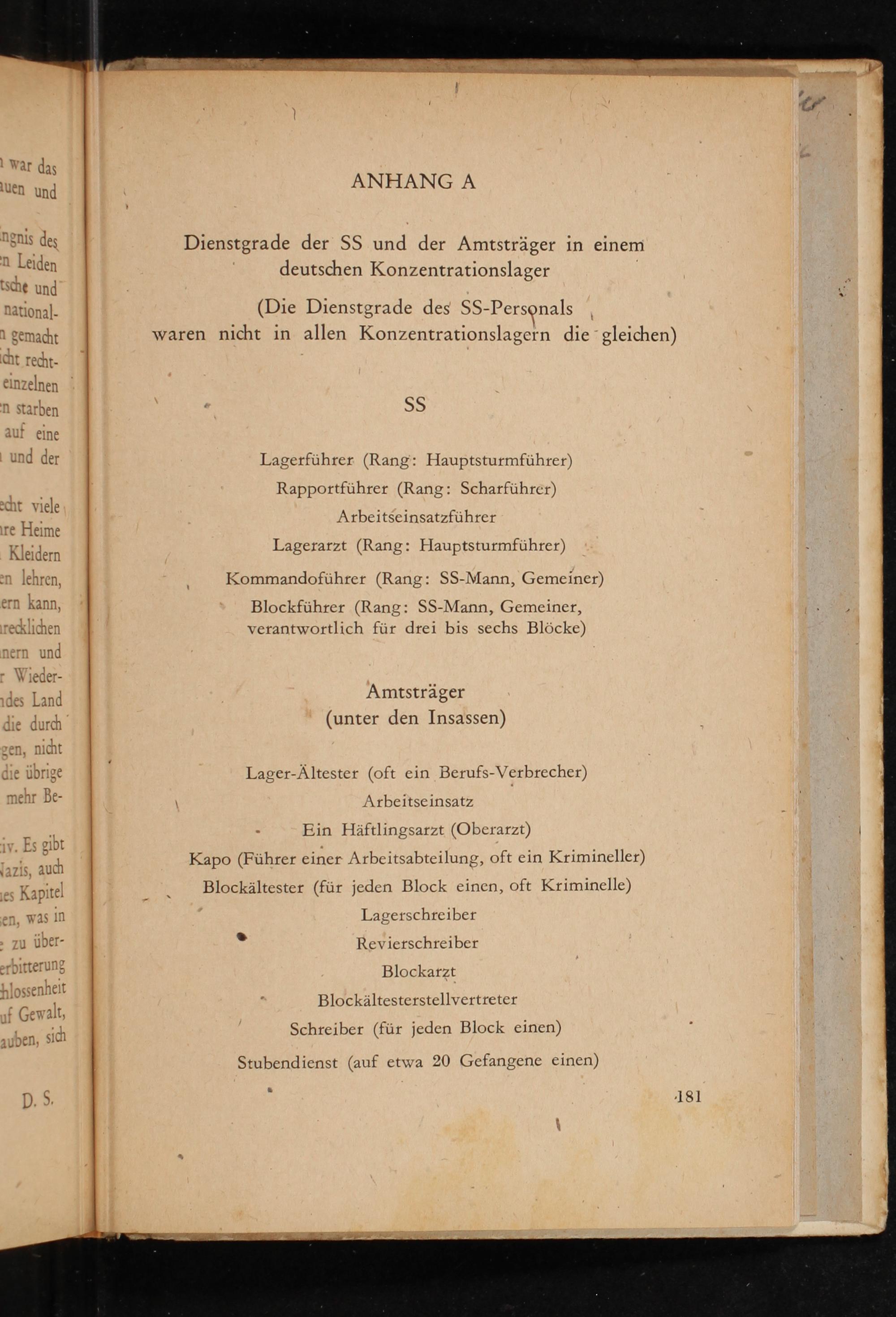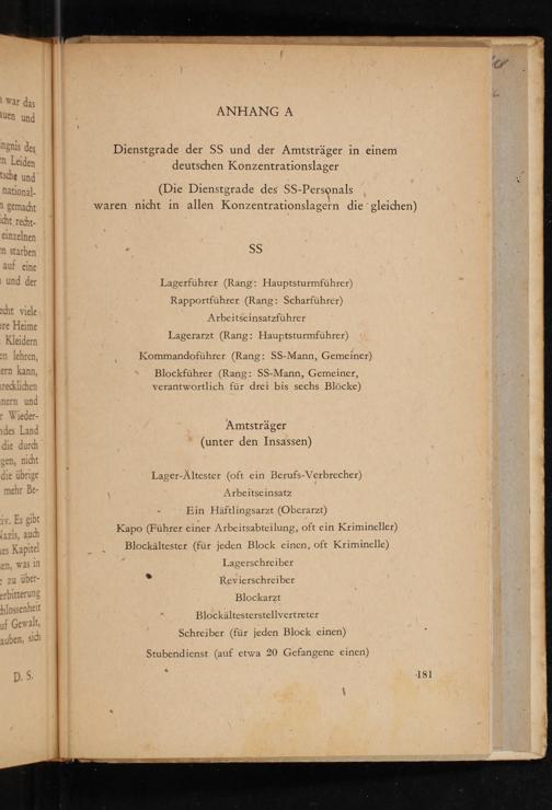 Lagerarzt( Rang: Hauptsturmführer) Kommandoführer( Rang: SS- Mann, Gemeiner) Blockführer( Rang: SS- Mann, Gemeiner, verantwortlich für drei bis sechs Blöcke)