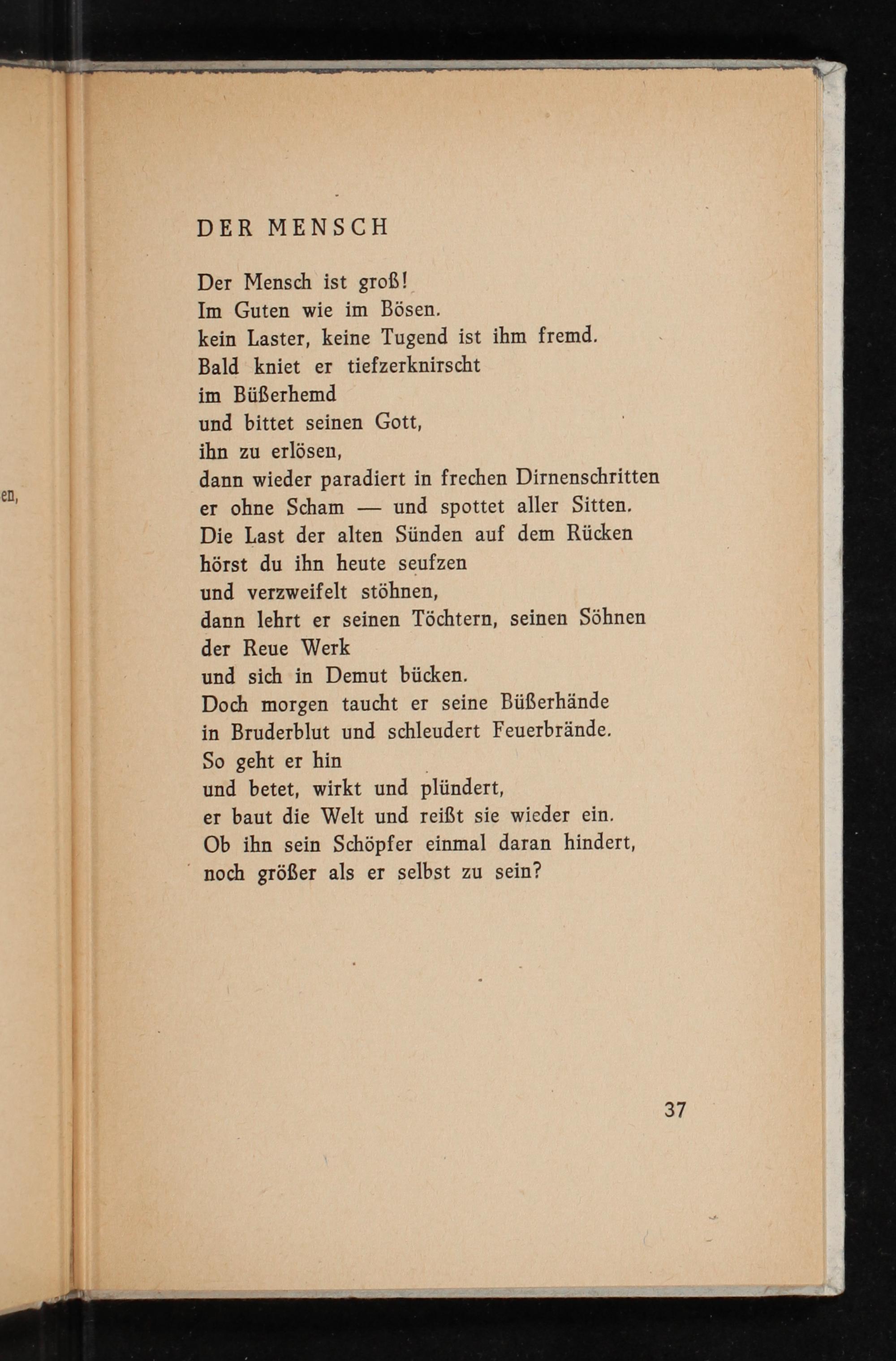 Der Mensch ist groß! Im Guten wie im Bösen. kein Laster, keine Tugend ist ihm fremd. Bald kniet er tiefzerknirscht im Büßerhemd und bittet seinen Gott, ihn zu erlösen, dann wieder paradiert in frechen Dirnenschritten er ohne Scham— und spottet aller Sitten, Die Last der alten Sünden auf dem Rücken hörst du ihn heute seufzen und verzweifelt stöhnen, dann lehrt er seinen Töchtern, seinen Söhnen der Reue Werk und sich in Demut bücken. Doch morgen taucht er seine Büßerhände in Bruderblut und schleudert Feuerbrände.