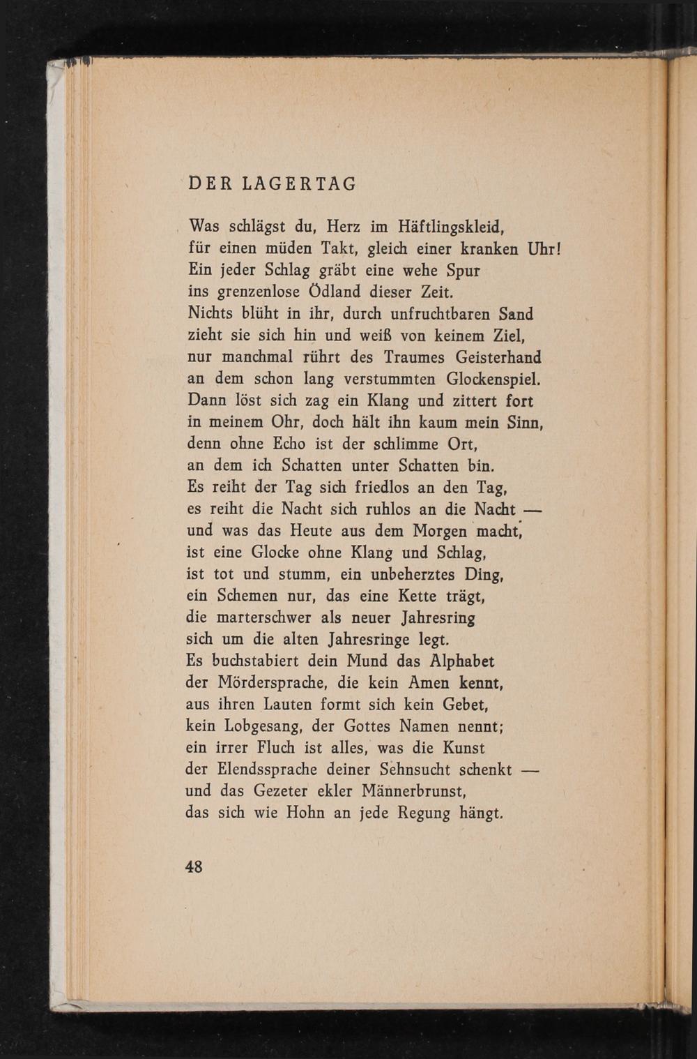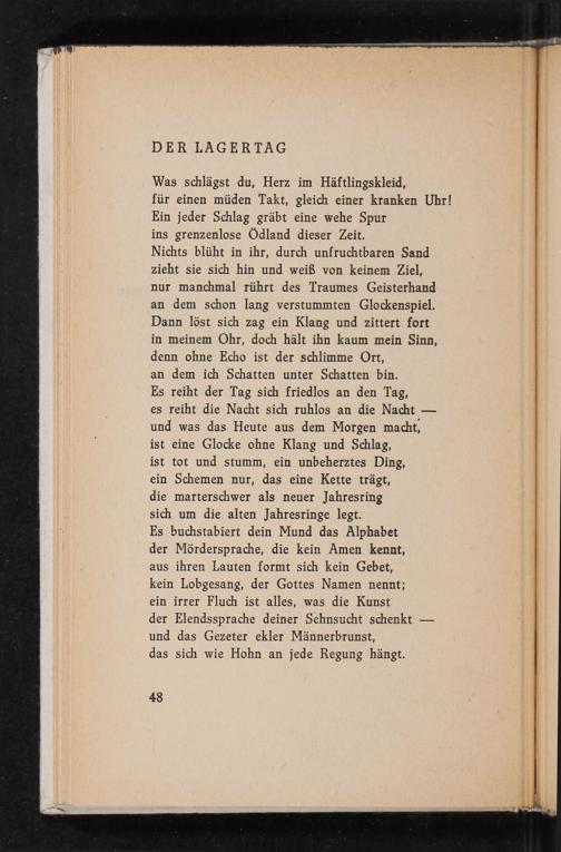 Was schlägst du, Herz im Häftlingskleid, für einen müden Takt, gleich einer kranken Uhr! Ein jeder Schlag gräbt eine wehe Spur
