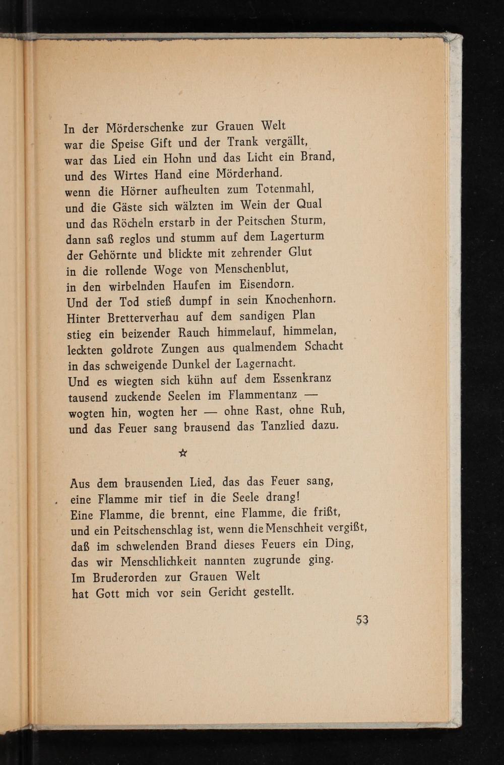 Eine Flamme, die brennt, eine Flamme, die frißt, und ein Peitschenschlag ist, wenn die Menschheit vergißt, daß im schwelenden Brand dieses Feuers ein Ding, das wir Menschlichkeit nannten zugrunde ging. Im Bruderorden zur Grauen Welt