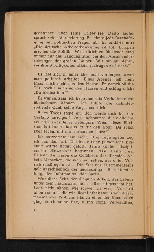 Wer diese Seite der illegalen Arbeit, des Lebens unter dem Faschismus nicht selbst mitgemacht hat, kann nicht ahnen, wie schwer sie war. Vor fast allen von uns, die wir illegal arbeiteten, stand dieses menschliche Problem. Manch einer der Kameraden ging durch seine Ehe, durch seine Verwandten,
