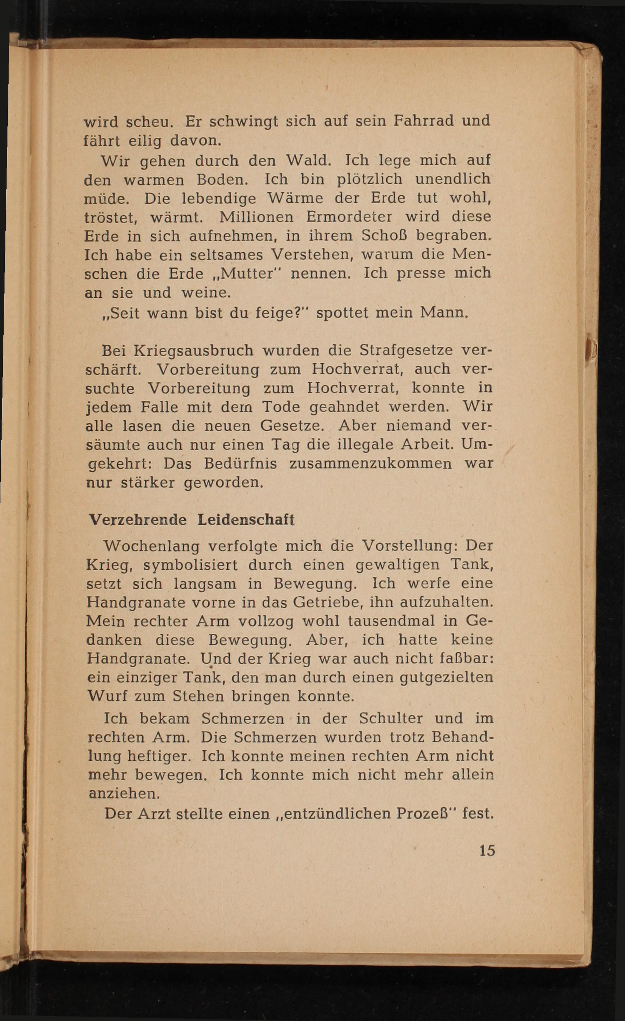 Wochenlang verfolgte mich die Vorstellung: Der Krieg, symbolisiert durch einen gewaltigen Tank, setzt sich langsam in Bewegung. Ich werfe eine Handgranate vorne in das Getriebe, ihn aufzuhalten. Mein rechter Arm vollzog wohl tausendmal in Gedanken diese Bewegung. Aber, ich hatte keine Handgranate. Und der Krieg war auch nicht faẞbar: ein einziger Tank, den man durch einen gutgezielten Wurf zum Stehen bringen konnte.