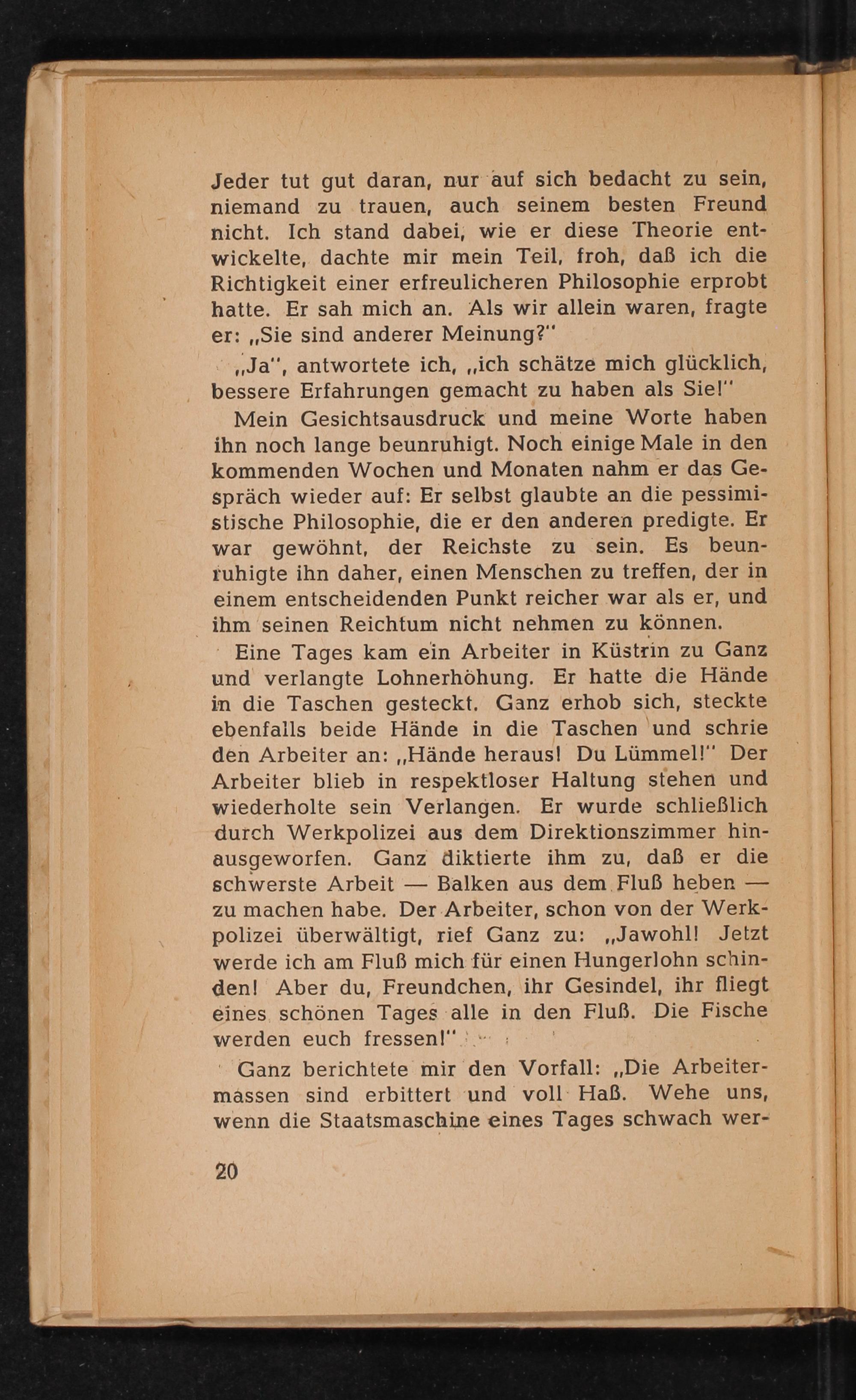 Jeder tut gut daran, nur auf sich bedacht zu sein, niemand zu trauen, auch seinem besten Freund nicht. Ich stand dabei, wie er diese Theorie entwickelte, dachte mir mein Teil, froh, daß ich die Richtigkeit einer erfreulicheren Philosophie erprobt hatte. Er sah mich an. Als wir allein waren, fragte er: ,, Sie sind anderer Meinung?"