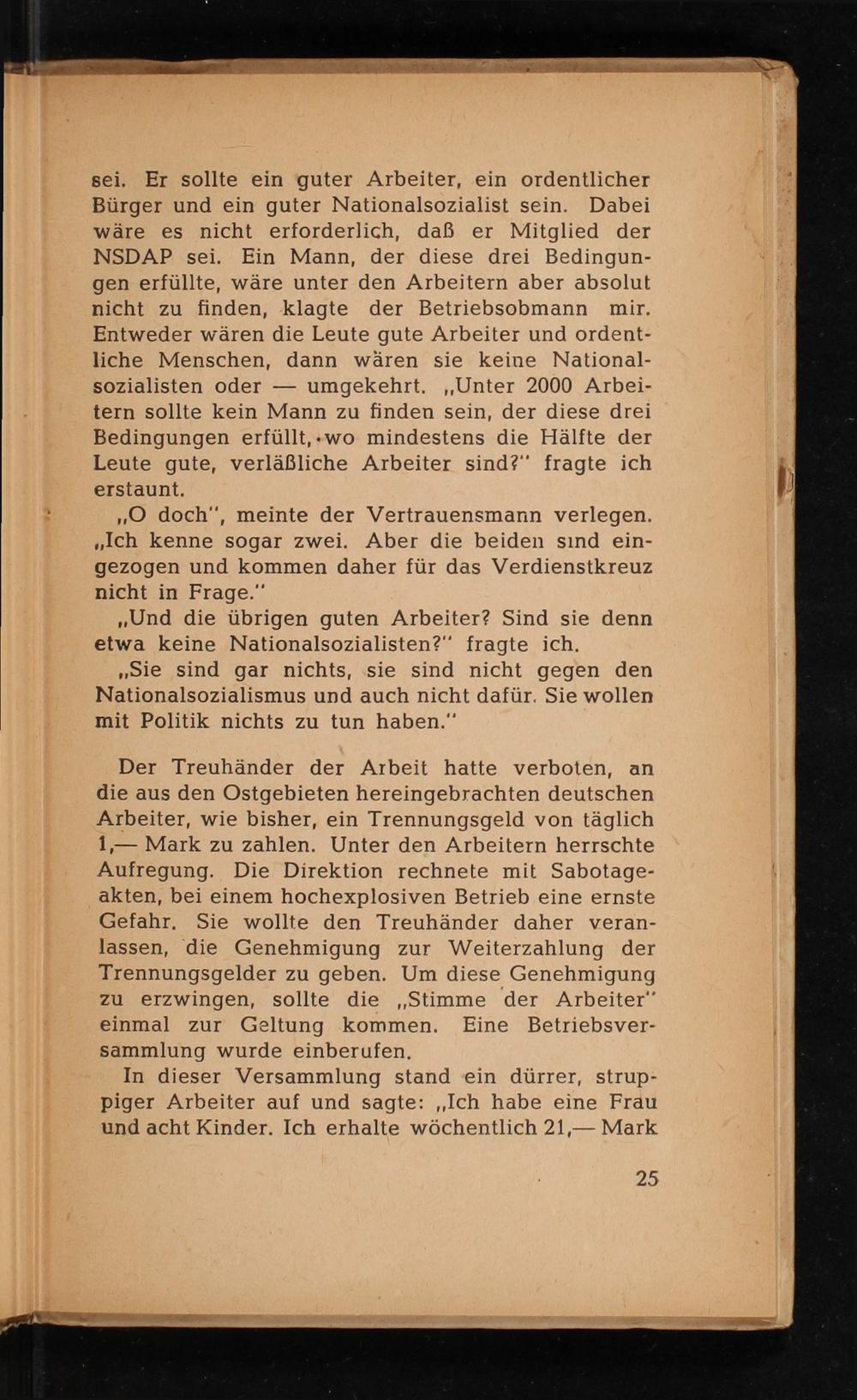 sei. Er sollte ein guter Arbeiter, ein ordentlicher Bürger und ein guter Nationalsozialist sein. Dabei wäre es nicht erforderlich, daß er Mitglied der NSDAP sei. Ein Mann, der diese drei Bedingungen erfüllte, wäre unter den Arbeitern aber absolut nicht zu finden, klagte der Betriebsobmann mir. Entweder wären die Leute gute Arbeiter und ordentliche Menschen, dann wären sie keine Nationalsozialisten oder umgekehrt. ,, Unter 2000 Arbeitern sollte kein Mann zu finden sein, der diese drei Bedingungen erfüllt, wo mindestens die Hälfte der Leute gute, verläßliche Arbeiter sind?" fragte ich erstaunt.