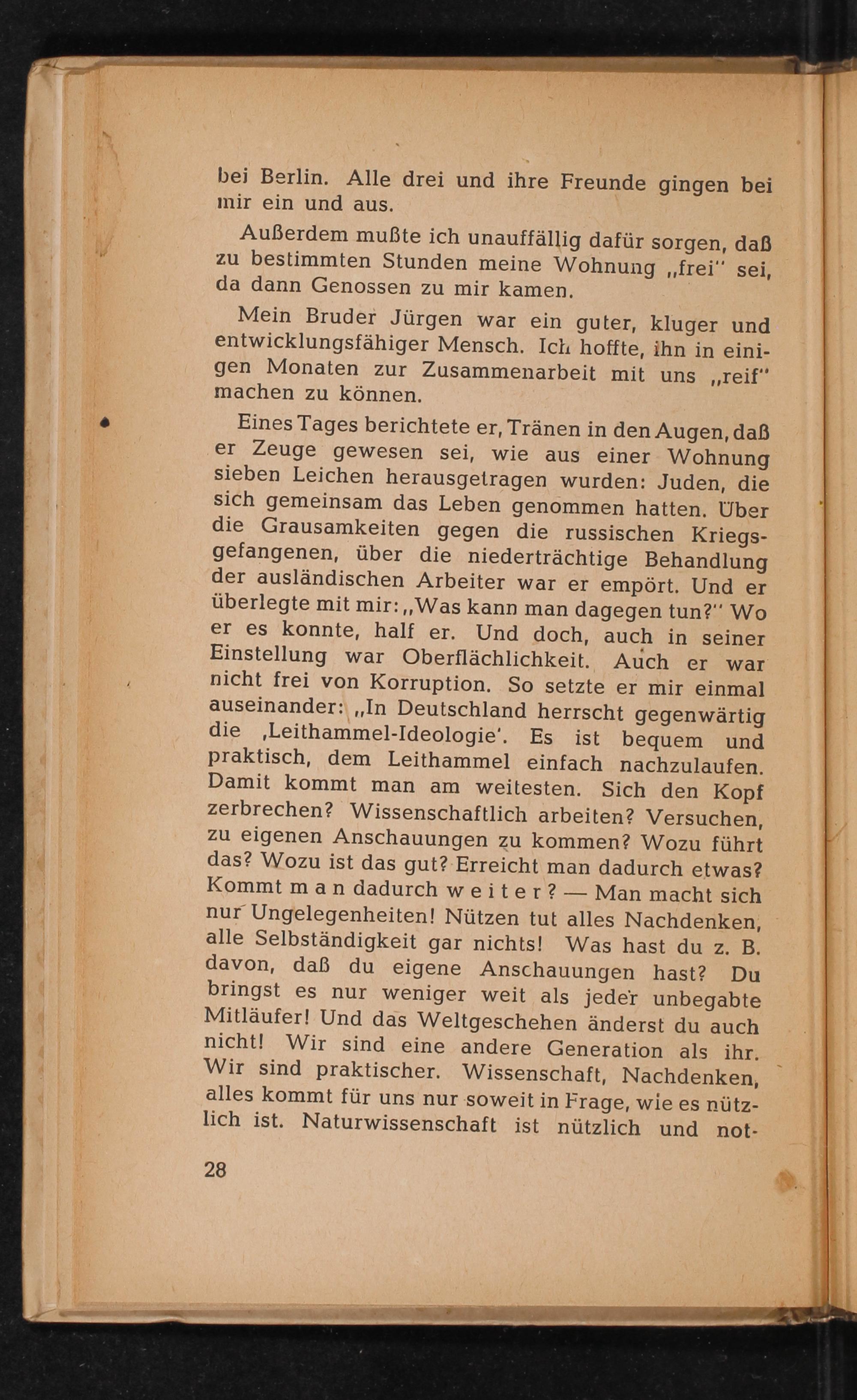 Eines Tages berichtete er, Tränen in den Augen, daß er Zeuge gewesen sei, wie aus einer Wohnung sieben Leichen herausgetragen wurden: Juden, die sich gemeinsam das Leben genommen hatten. Über die Grausamkeiten gegen die russischen Kriegsgefangenen, über die niederträchtige Behandlung der ausländischen Arbeiter war er empört. Und er überlegte mit mir: ,, Was kann man dagegen tun?" Wo er es konnte, half er. Und doch, auch in seiner Einstellung war Oberflächlichkeit. Auch er war nicht frei von Korruption. So setzte er mir einmal auseinander: ,, In Deutschland herrscht gegenwärtig die Leithammel- Ideologie'. Es ist bequem und praktisch, dem Leithammel einfach nachzulaufen. Damit kommt man am weitesten. Sich den Kopf zerbrechen? Wissenschaftlich arbeiten? Versuchen, zu eigenen Anschauungen zu kommen? Wozu führt das? Wozu ist das gut? Erreicht man dadurch etwas? Kommt man dadurch weiter? Man macht sich nur Ungelegenheiten! Nützen tut alles Nachdenken, alle Selbständigkeit gar nichts! Was hast du z. B. davon, daß du eigene Anschauungen hast? Du bringst es nur weniger weit als jeder unbegabte Mitläufer! Und das Weltgeschehen änderst du auch nicht! Wir sind eine andere Generation als ihr. Wir sind praktischer. Wissenschaft, Nachdenken, alles kommt für uns nur soweit in Frage, wie es nützlich ist. Naturwissenschaft ist nützlich und not