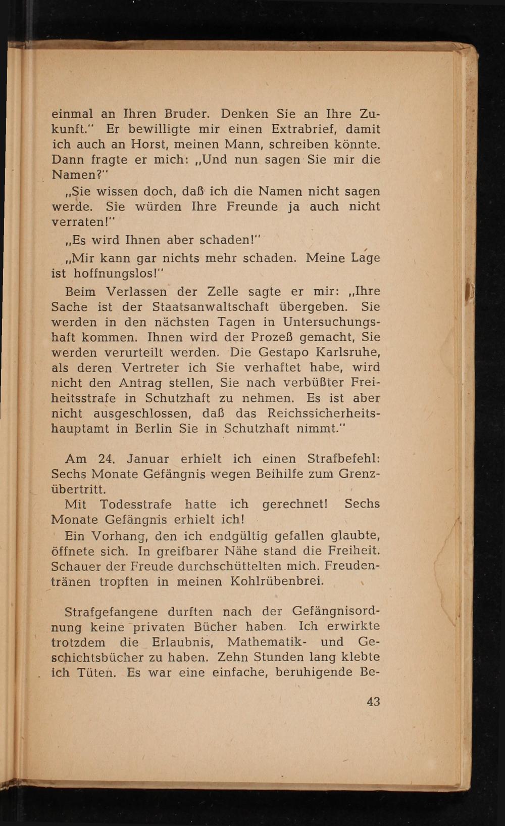 einmal an Ihren Bruder. Denken Sie an Ihre Zukunft." Er bewilligte mir einen Extrabrief, damit ich auch an Horst, meinen Mann, schreiben könnte. Dann fragte er mich: ,, Und nun sagen Sie mir die Namen?"