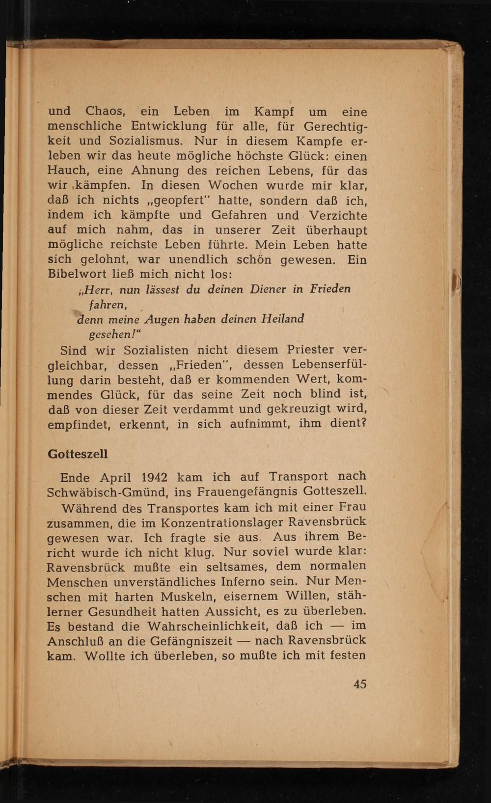 und Chaos, ein ein Leben Leben im Kampf um eine menschliche Entwicklung für alle, für Gerechtigkeit und Sozialismus. Nur in diesem Kampfe erleben wir das heute mögliche höchste Glück: einen Hauch, eine Ahnung des reichen Lebens, für das wir kämpfen. In diesen Wochen wurde mir klar, daß ich nichts geopfert" hatte, sondern daß ich, indem ich kämpfte und Gefahren und Verzichte auf mich nahm, das in unserer Zeit überhaupt mögliche reichste Leben führte. Mein Leben hatte sich gelohnt, war unendlich schön gewesen. Ein Bibelwort ließ mich nicht los: